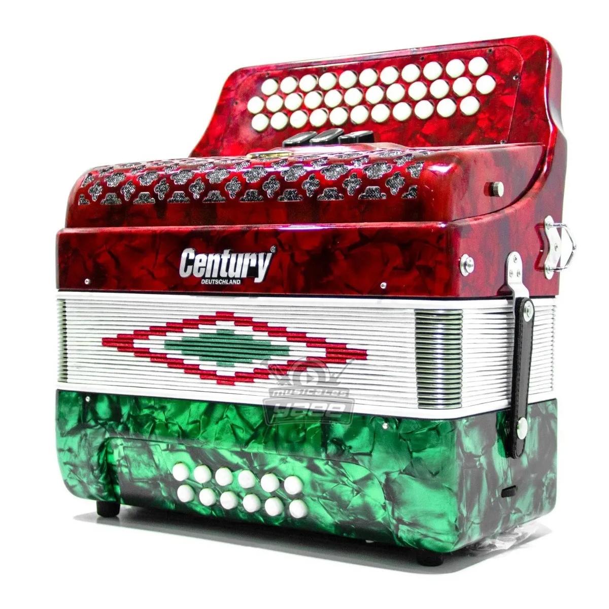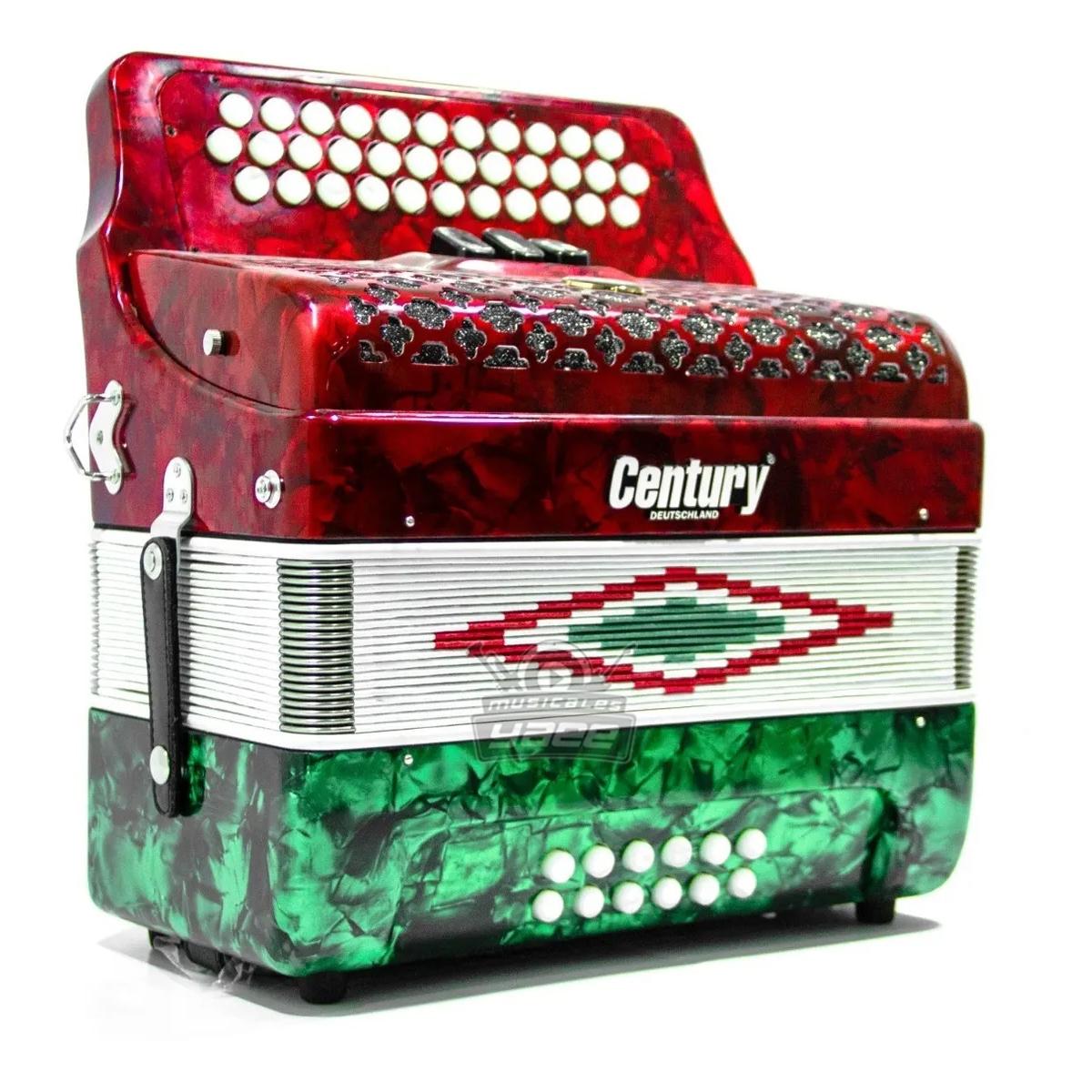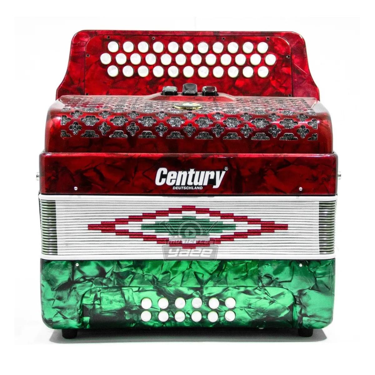 Acordeón Century diatónica con 34 botones, 12 bajos y 3 registros. Acabado bandera de México.