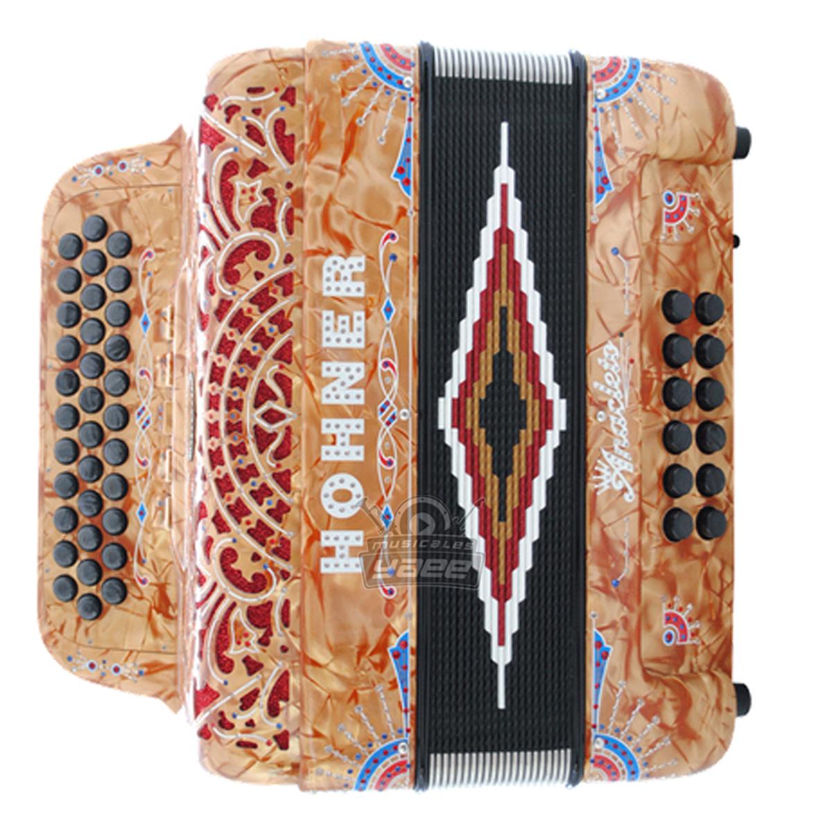 Sensación y respuesta inigualables En la creación de la Serie Anacleto, HOHNER consultó con los artistas más famosos del mundo para abordar específicamente las dimensiones de las teclas, la sensación táctil y la acción del mecanismo suave para una reproducción precisa. Eduardo Hernández de Los Tigres del Norte comentó al tocar la nueva Serie Anacleto "Cuando puse mi mano en el diapasón, pude ver de inmediato lo que tenía en mis manos sin siquiera tocarlo". Ejecución detallada de calidad superior Cada acordeón es hecho a mano y diseñado con patrones de cristal y esquemas de color para adaptarse al gusto del artista y crear presencia en el escenario. Mejor calidad de sonido Cada acordeón de la serie de Anacleto se hace usando las cañas hechas a mano (mano) de la más alta calidad disponible. Cada Ancleto viene con una funda de instrumento forrada de terciopelo y un sistema de correa de cuero genuino. 34 Treble Botones 12 Bajo Botones 9 Interruptor Estribillo: LMMM (4 cañas) Bloques de Reed de Bajo (Opcional) Tamaño: 14 "X 7.7" Peso: 15.4 libras Reeds 100% artesanal Incluye estuche de felpa con correas de cuero .