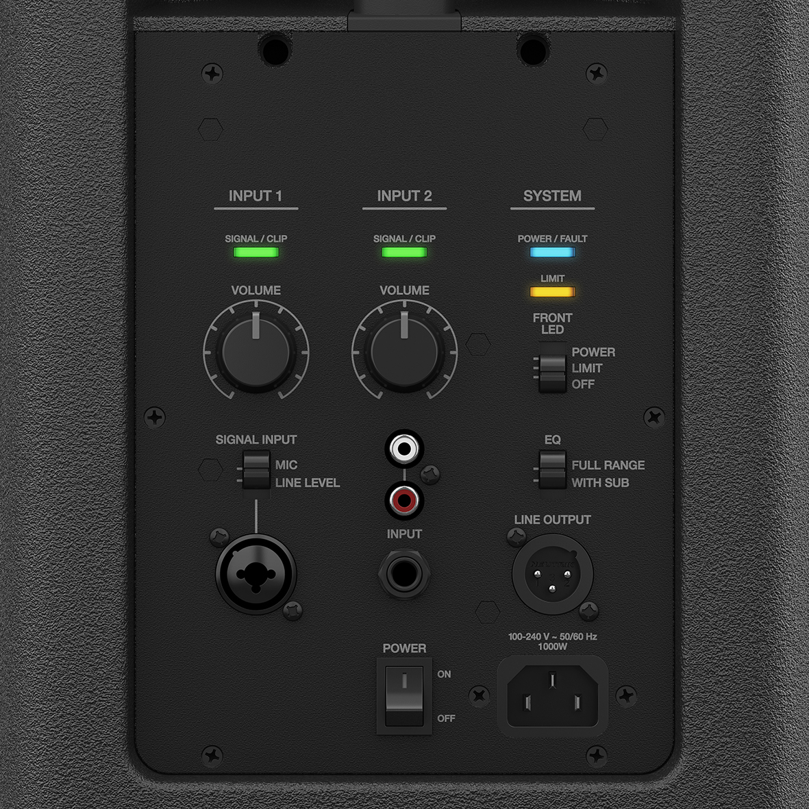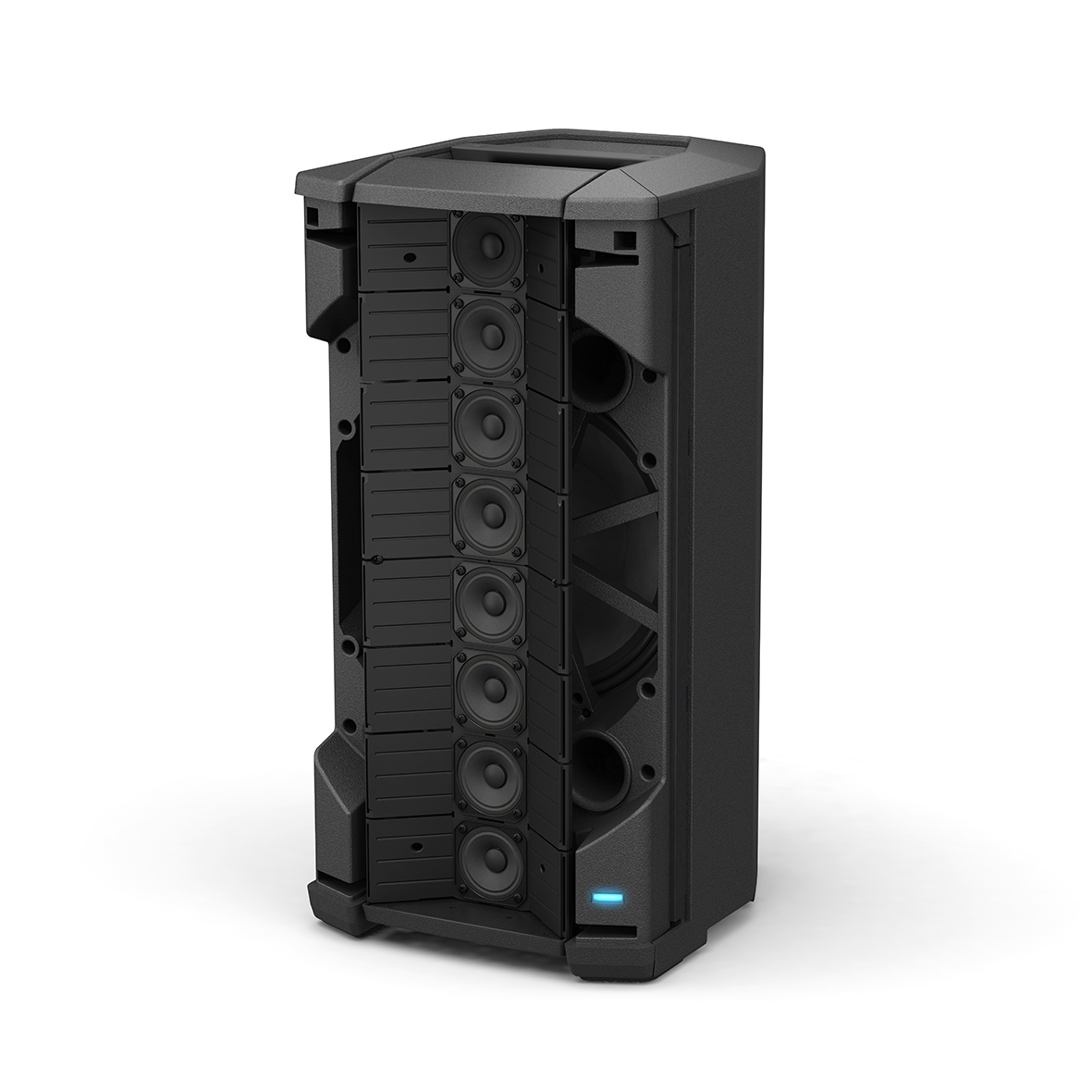 Diseño portátil e independiente con un amplificador incorporado de 1000 watts y 9 transductores: 8 drivers de salida alta y un woofer de 30.5 cm (12") de alta potencia