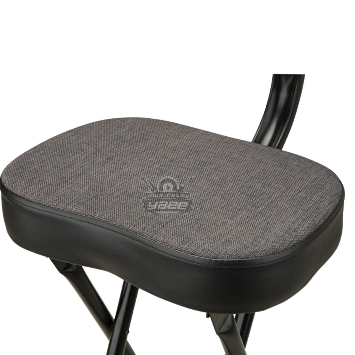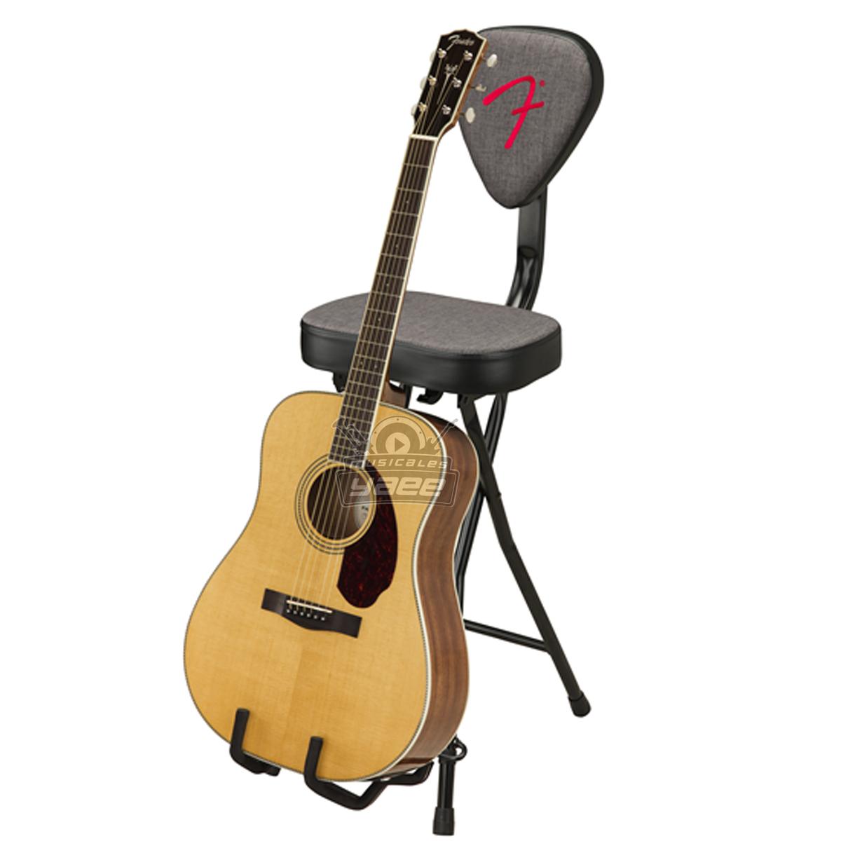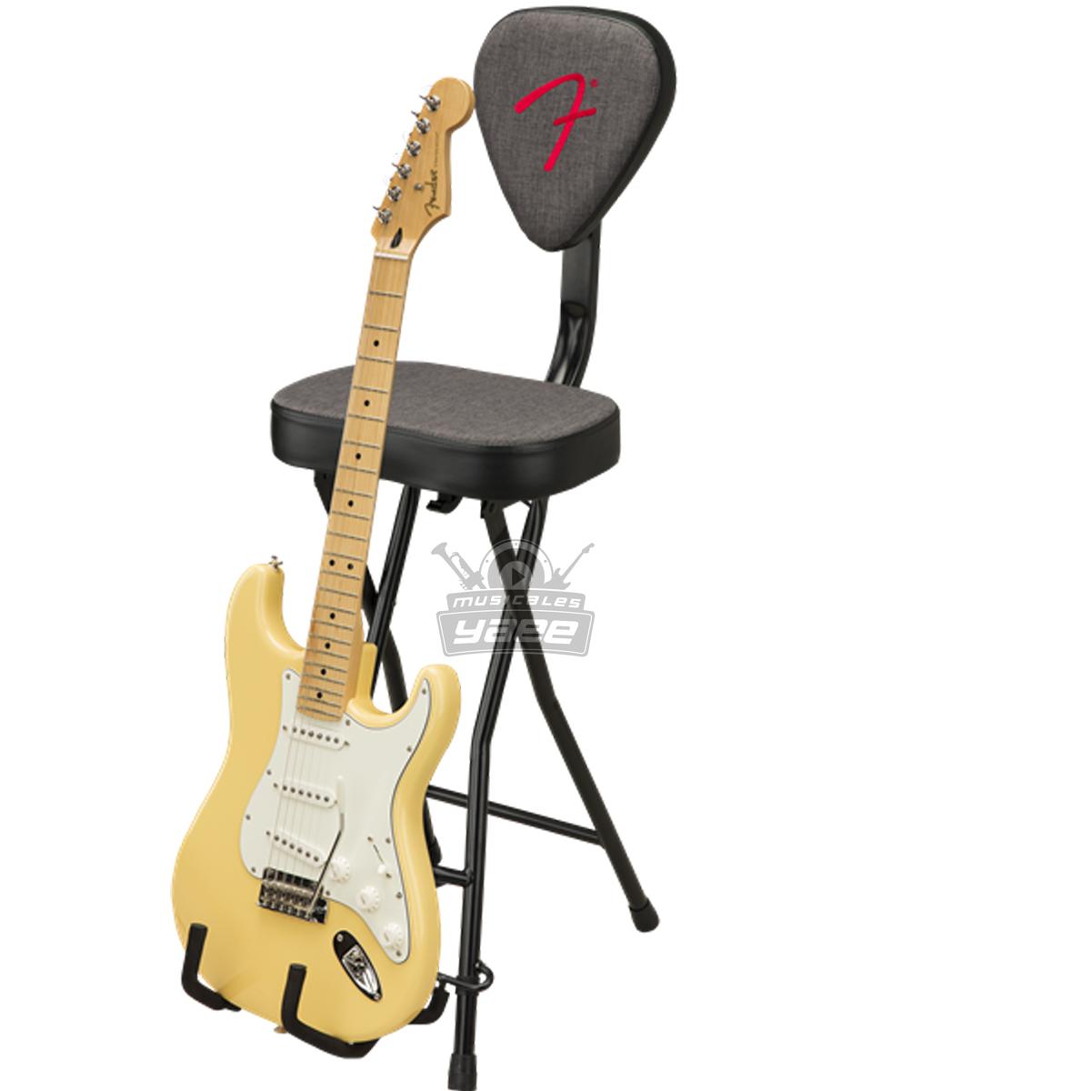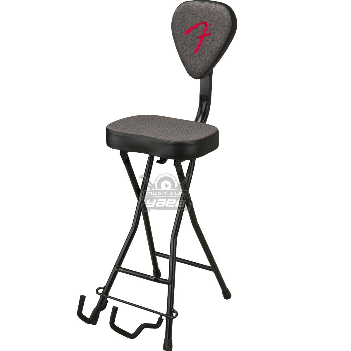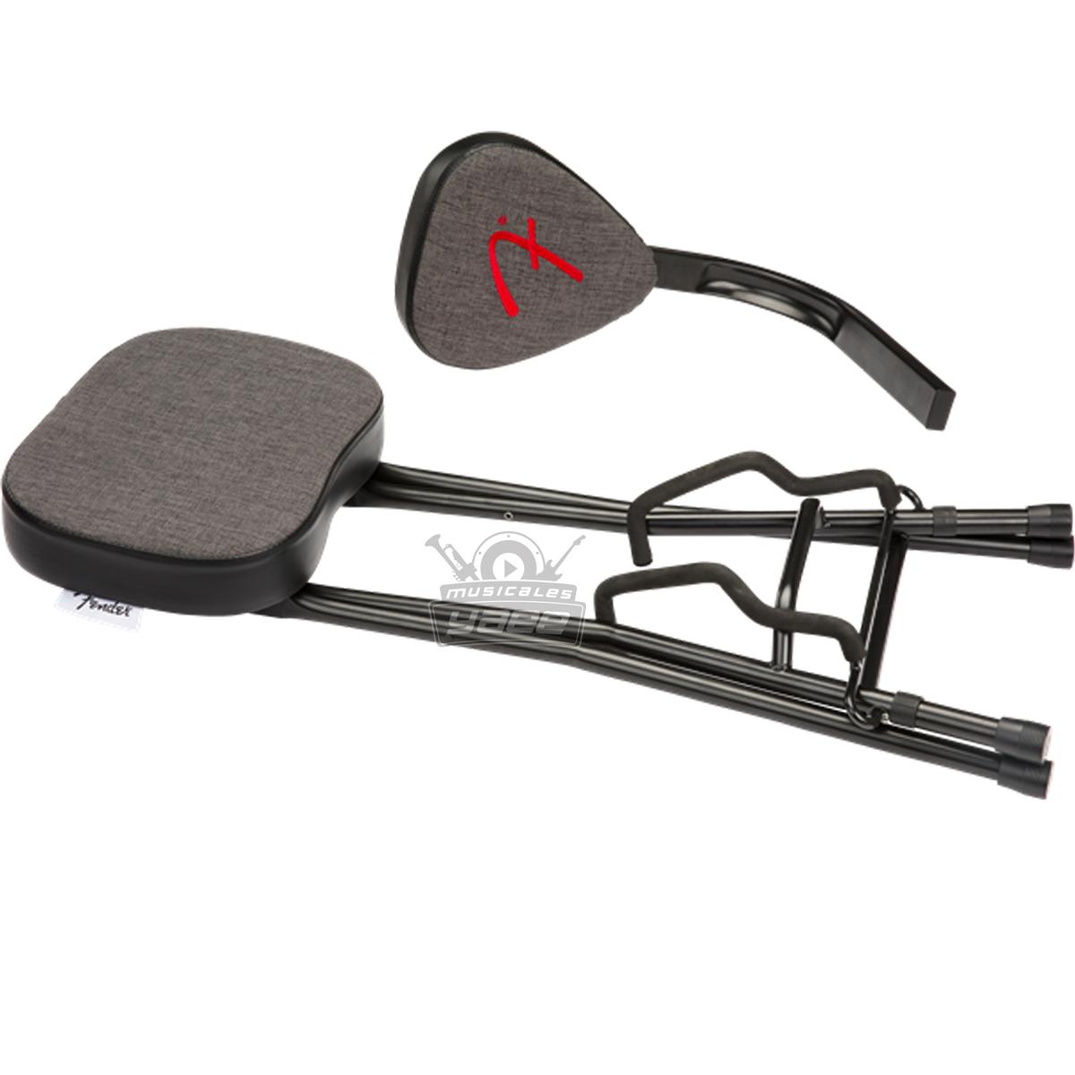 Ideal para cualquier guitarrista o bajista, esta combinación de asiento y soporte de guitarra hace que sea fácil tener una sesión de práctica productiva o sobrevivir una larga actuación. Cómodamente acolchado para largas sesiones de juego, el asiento y el respaldo en forma de pico Fender 351 con el logotipo bordado "F" están cubiertos de tela tejida de tweed gris. La base del instrumento abatible hacia arriba / abajo, diseñada para adaptarse a la mayoría de las guitarras y bajos, muestra su instrumento de forma segura, mientras que el reposapiés de barra transversal integrado se adapta a casi cualquier posición de la pierna. Diseñado para facilitar el transporte, las patas del asiento se pliegan y el respaldo es extraíble para hacerlo aún más compacto cuando se dirige a un concierto.