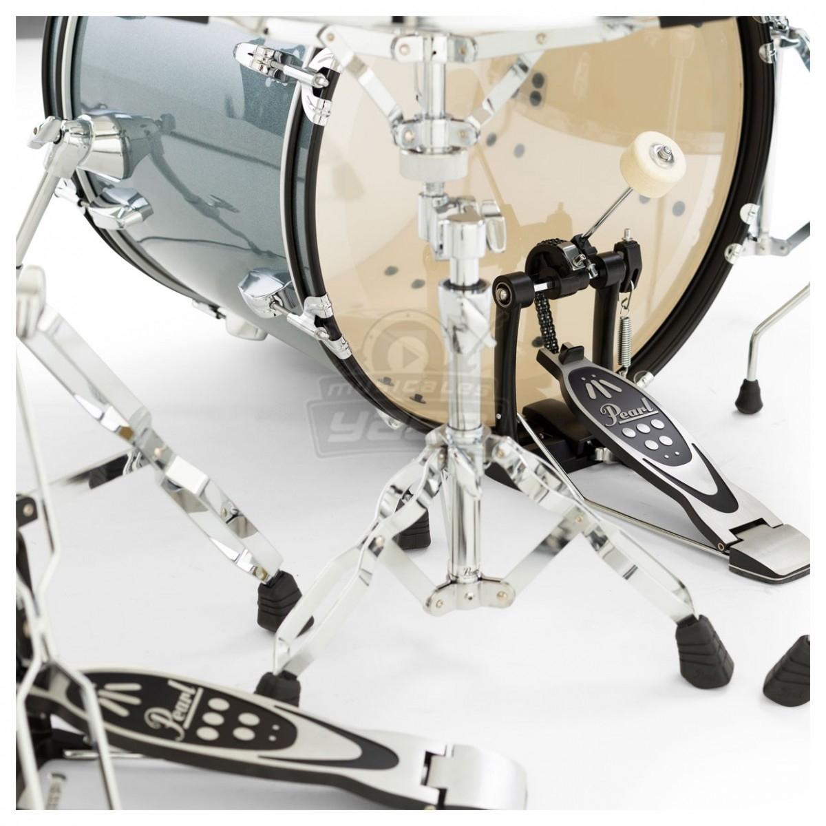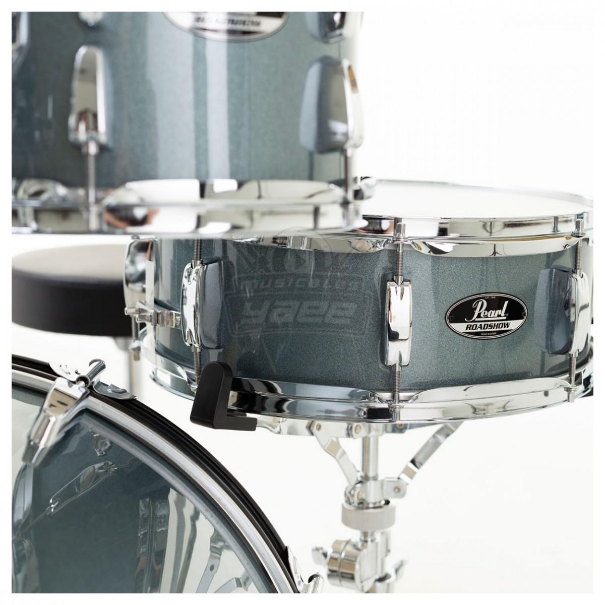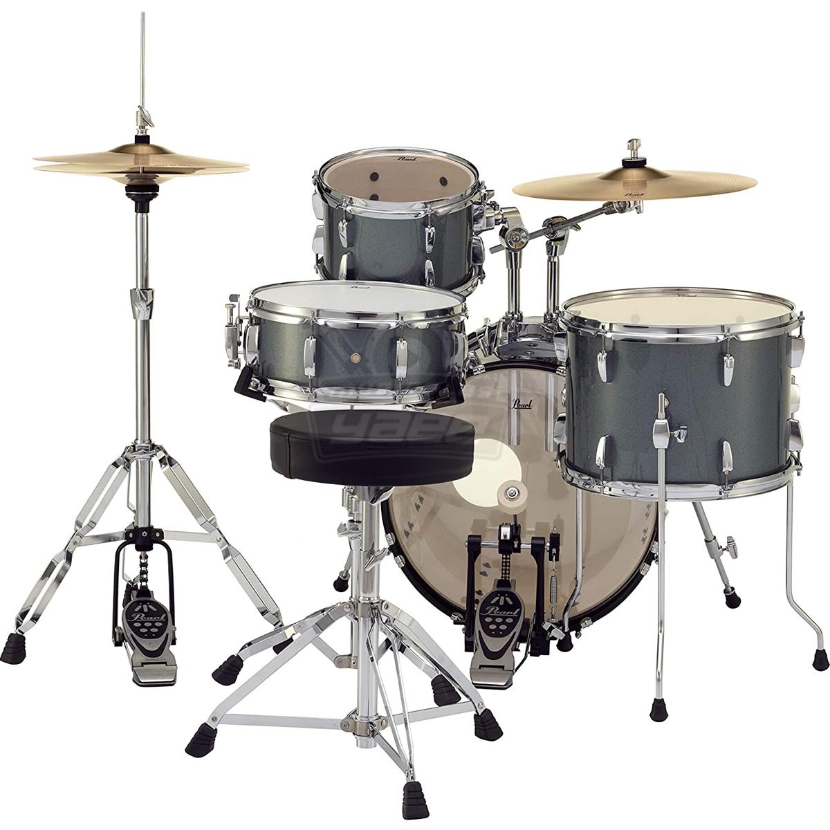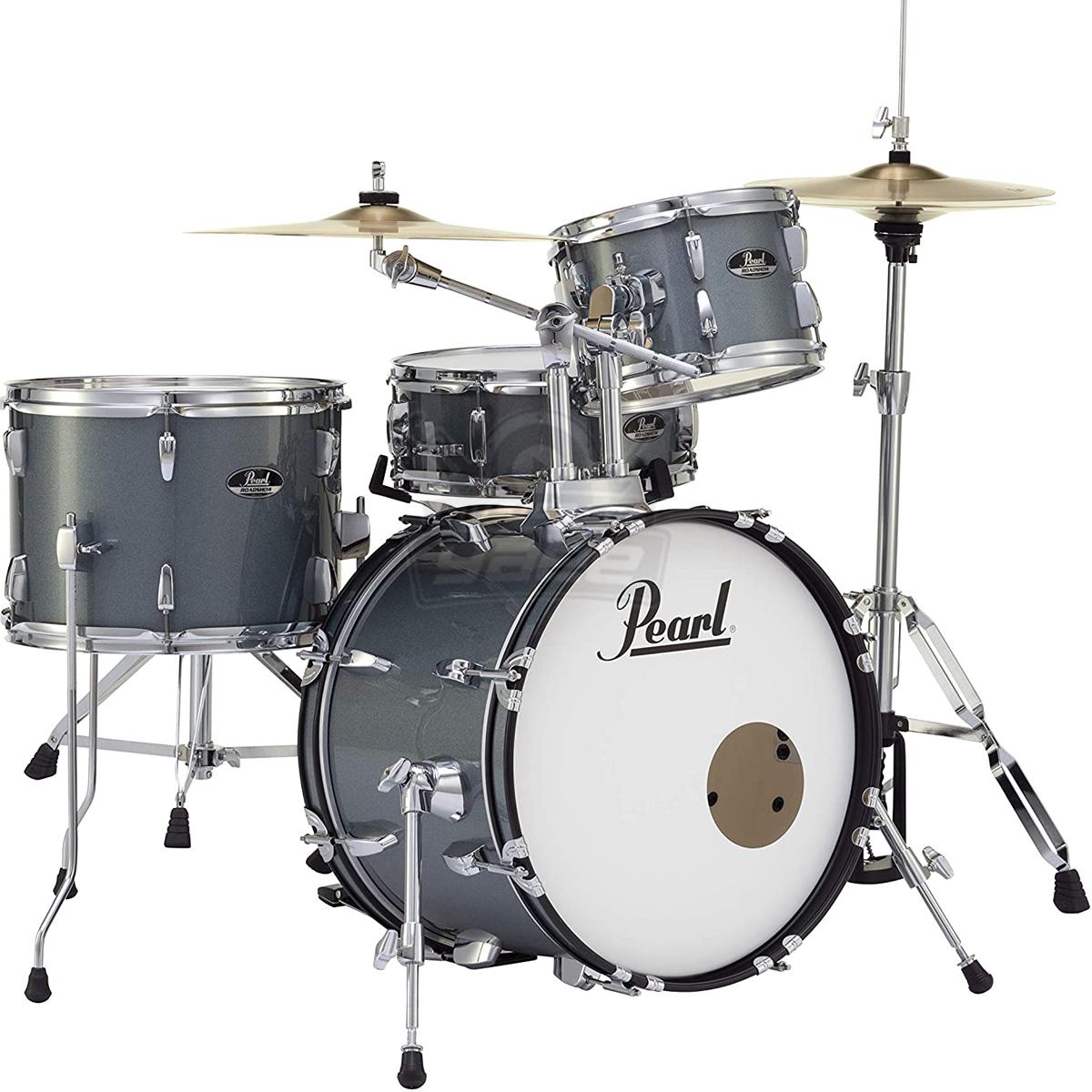 Bateria Pearl de 4 piezas color Charcoal Metallic, Bombo 18×12, redoblante 13×5, Tom 1 10×7 y Tom de Piso 14×10, acompañada de base de platillos, base para Hi-Hat, base de redoblante, pedal, silla para el baterista, base para el Tom y Crash-Platos no incluidos, bolsa para las baquetas, todas las bases de la serie ROADSHOW tienen doble refuerzo, altura y ángulo ajustable, y cuentan con patas dobles para resistir los golpes de alto impacto.