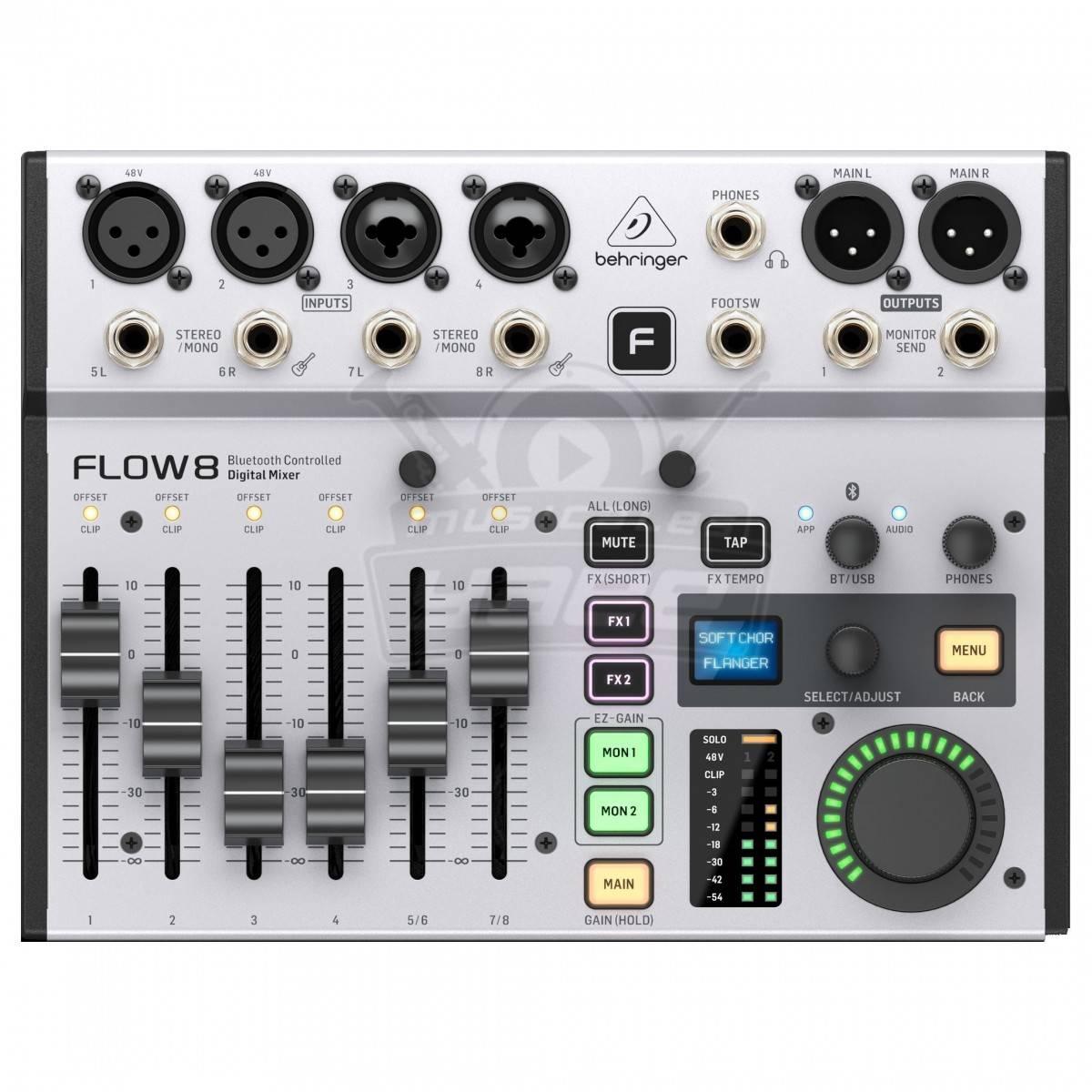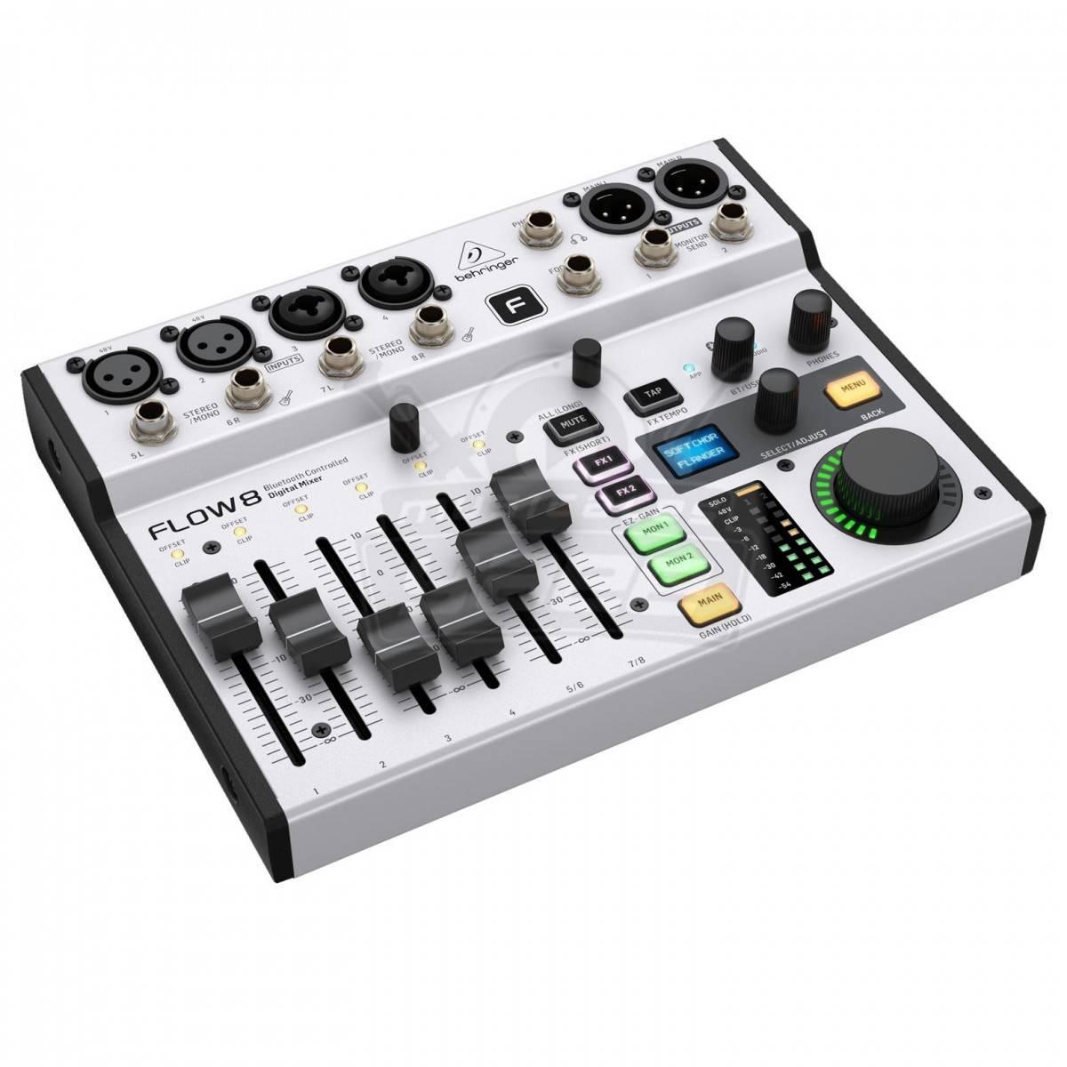 El mezclador digital Behringer FLOW 8 de 8 canales combina una funcionalidad excepcional con características intuitivas y fáciles de usar para ofrecer un mezclador fenomenalmente versátil. El Flow 8 brinda ayuda siempre que puede, desde establecer automáticamente los niveles de ganancia hasta permitirle almacenar una cantidad ilimitada de preajustes para recuperarlos instantáneamente en cualquier momento.