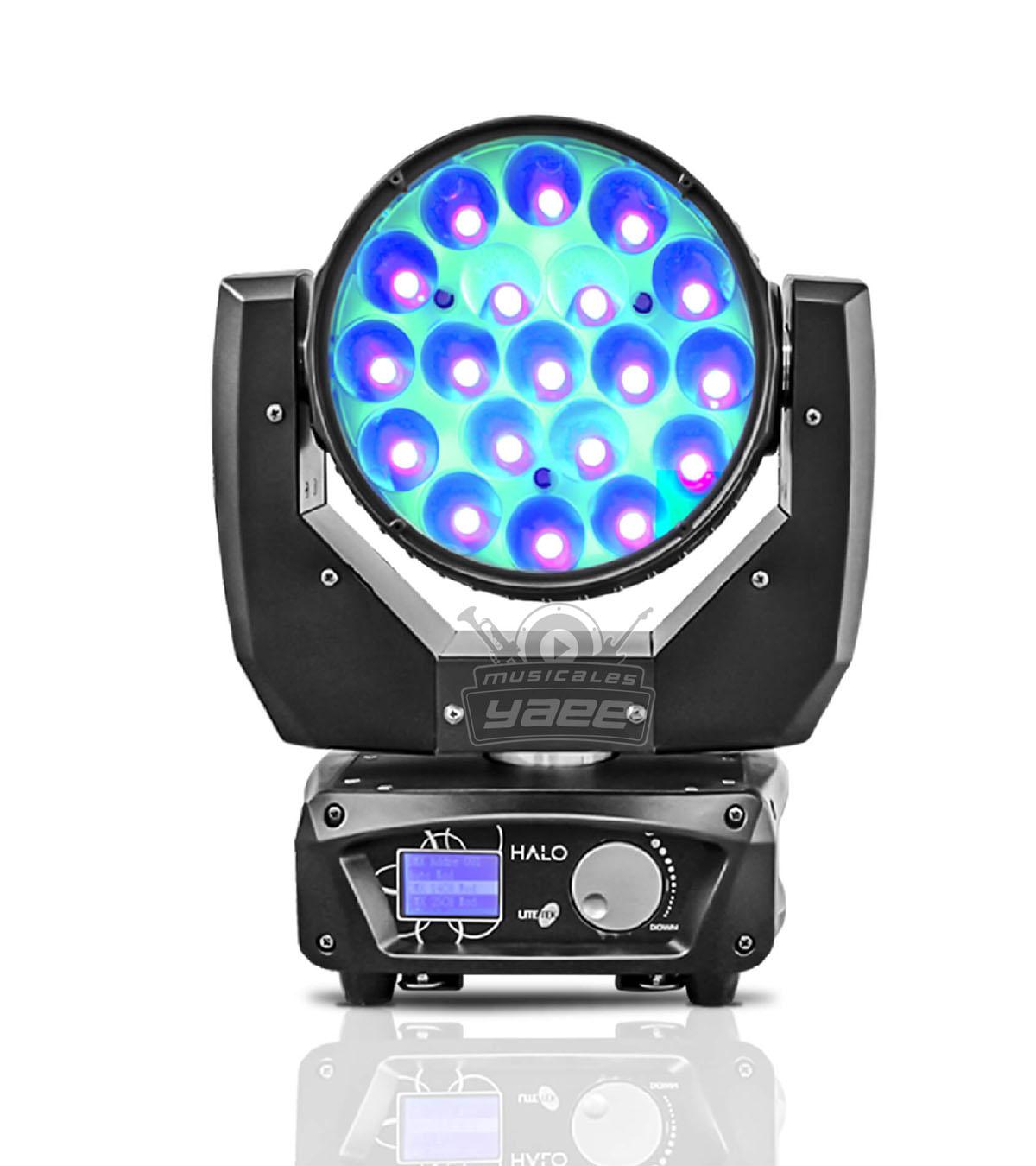 HALO tiene 19 leds de 10W ultra brillantes RGBW 4 en 1, su función como WASH es de excelente potencia y abertura ajustable. Gracias a su función de zoom, que le permite cerrar para hacer un beam de color....