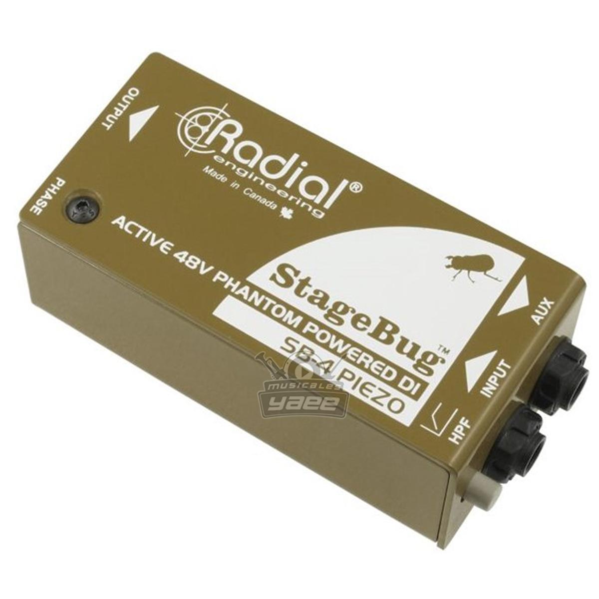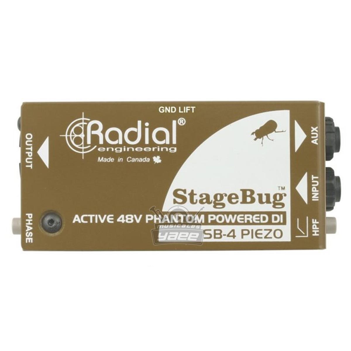 El Radial StageBug SB-4 es una caja directa activa que ha sido optimizada para su uso con transductores piezoeléctricos como los que se usan en guitarra clásica, violín, mandolina y contrabajo. Cuenta con una alta impedancia de entrada de 5 mega-ohmios que ensancha a la vez la respuesta de frecuencia al tiempo que reduce los picos y los picos que se encuentran comúnmente con los dispositivos piezoeléctricos. Esto se complementa con un filtro de paso alto que desplaza suavemente los graves excesivos.