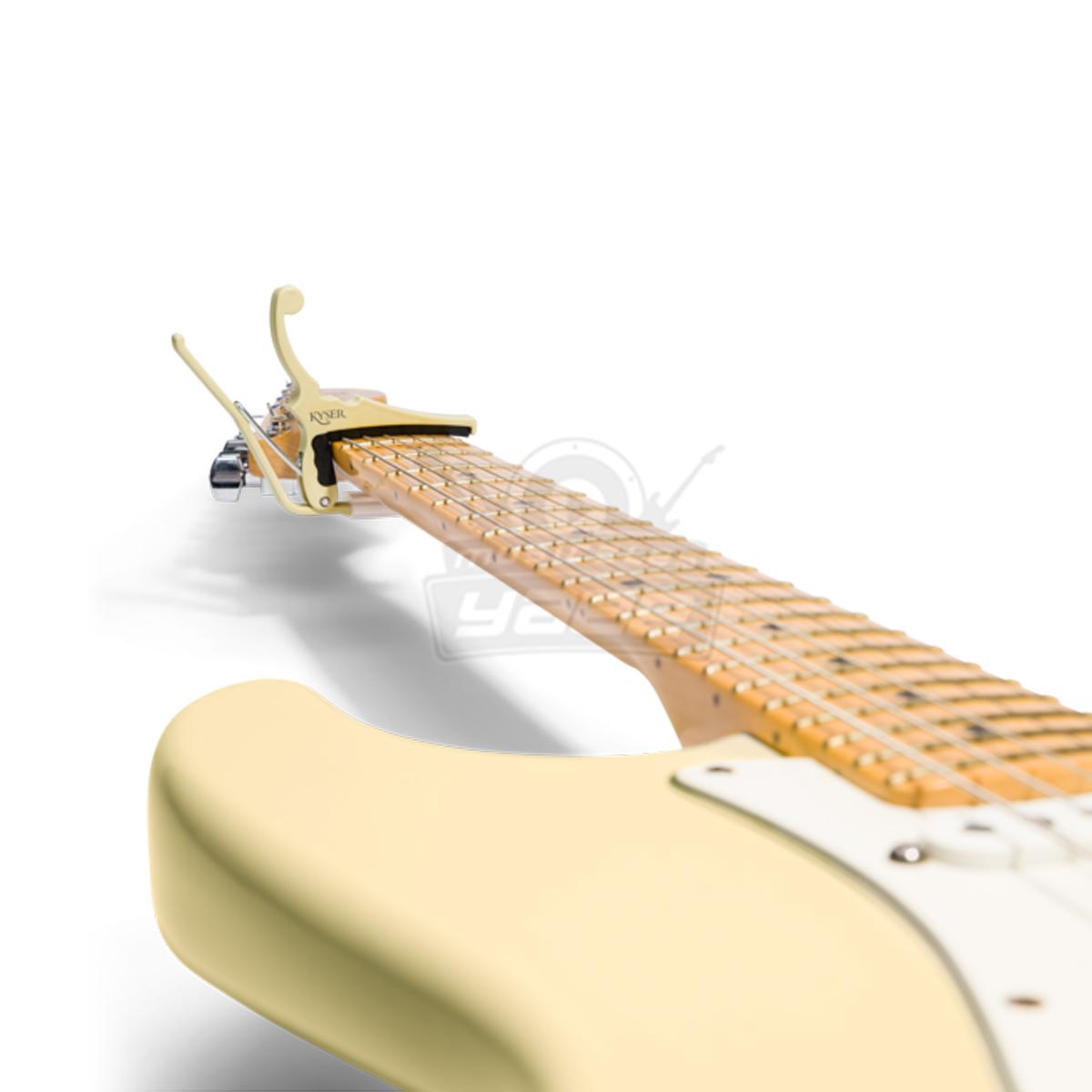 Dos marcas legendarias. Cuatro acabados legendarios. Kyser ® Musical Products, Inc. ha colaborado con Fender ® Musical Instruments Corp. para lanzar su nueva serie de "colores clásicos" Quick-Change ® de la guitarra eléctrica Capos. Las cejillas cuentan con la precisión ColorMatch Process ™ de Kyser  junto con un radio de 9.5 "de nuevo diseño que ha  sido diseñado contra numerosos diapasones de varios modelos de guitarras eléctricas para garantizar una tensión y un ajuste precisos.