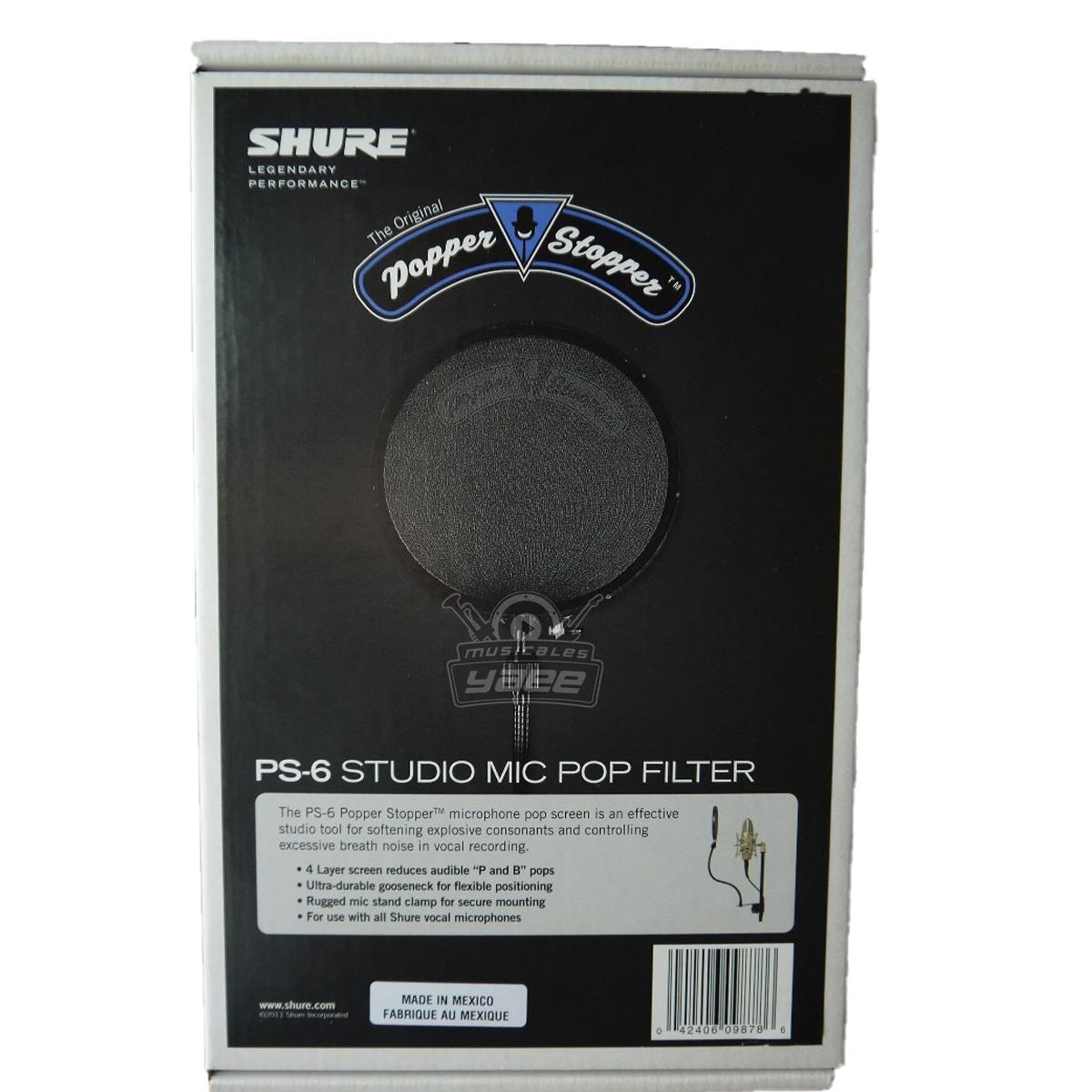 El Filtro Anti-Pop PS-6 de Shure, se usa con micrófonos para proteger el diafragma de las explosiones repentinas de sonido que pueden causar un efecto de estallido. El escudo es “transparente” al paso del sonido y no interfiere con el movimiento del sonido hacia el micrófono. Los filtros anti-pop se ven comúnmente en los estudios de grabación situados entre 1″ y 8″ frente a un micrófono.
