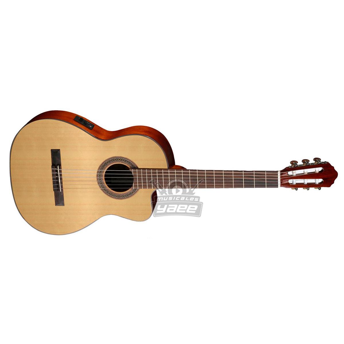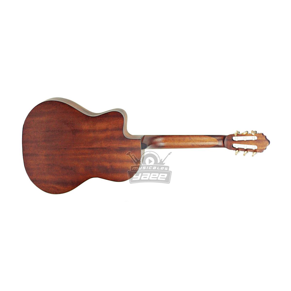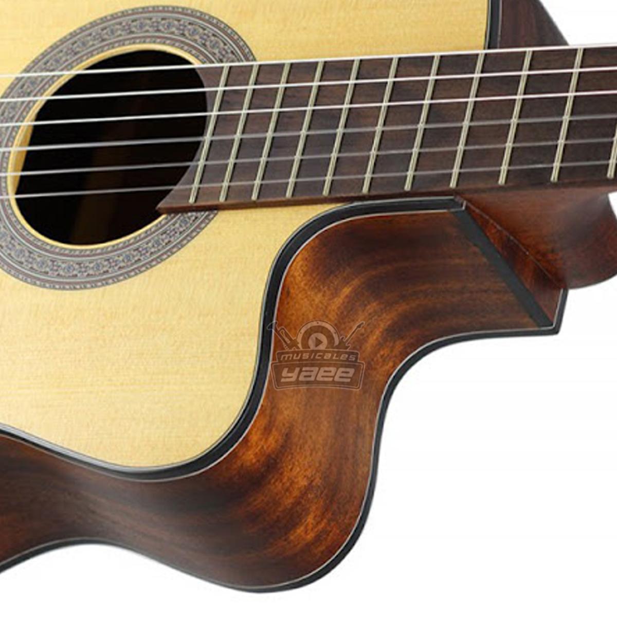 La AC120CE como guitarra clásica recorte (cutaway) presenta una tapa de Abeto, parte trasera y laterales de Okoume, diapasón de Merbau y cuerdas Savarez cristal.