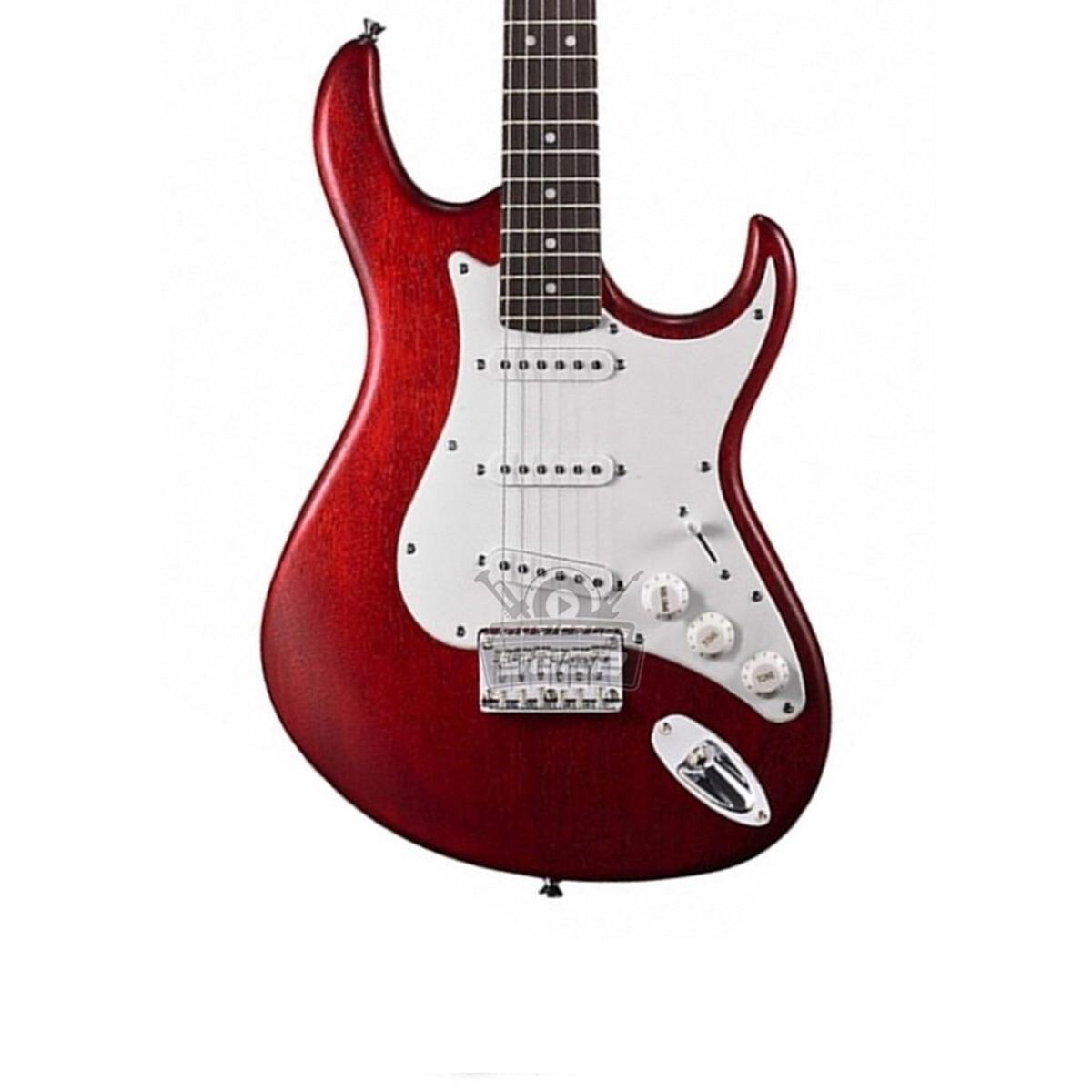 Guitarra eléctrica Cort G100 negra mate con cuerpo de Meranti, brazo de maple, diapason de palo de rosa con 22 trastes tamaño medio, puente fijo, 3 pastillas single coil Powersound, selector de pastillas de 5 pasos y 3 perillas para el control de volumen, graves y agudos.