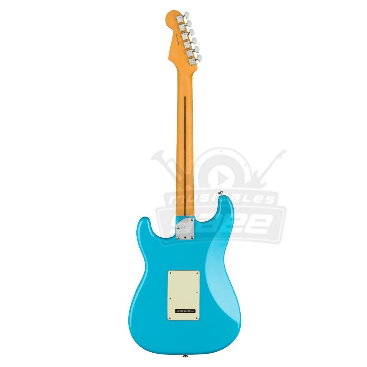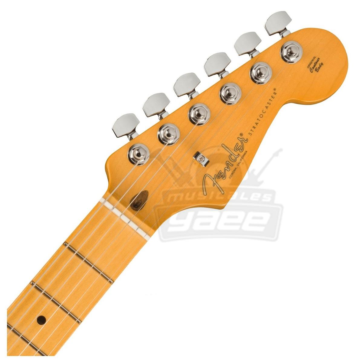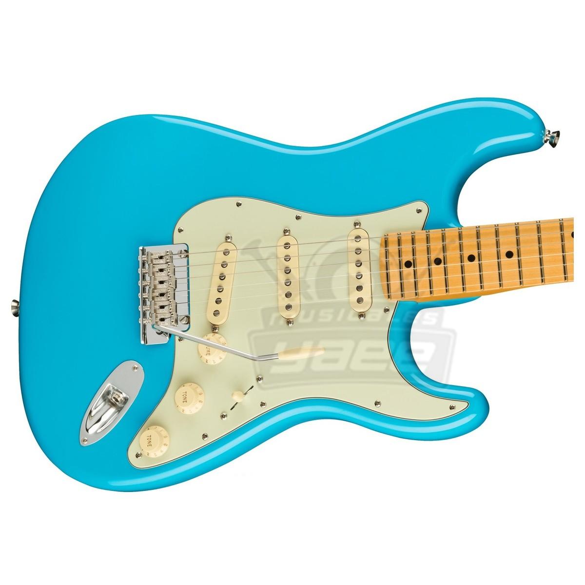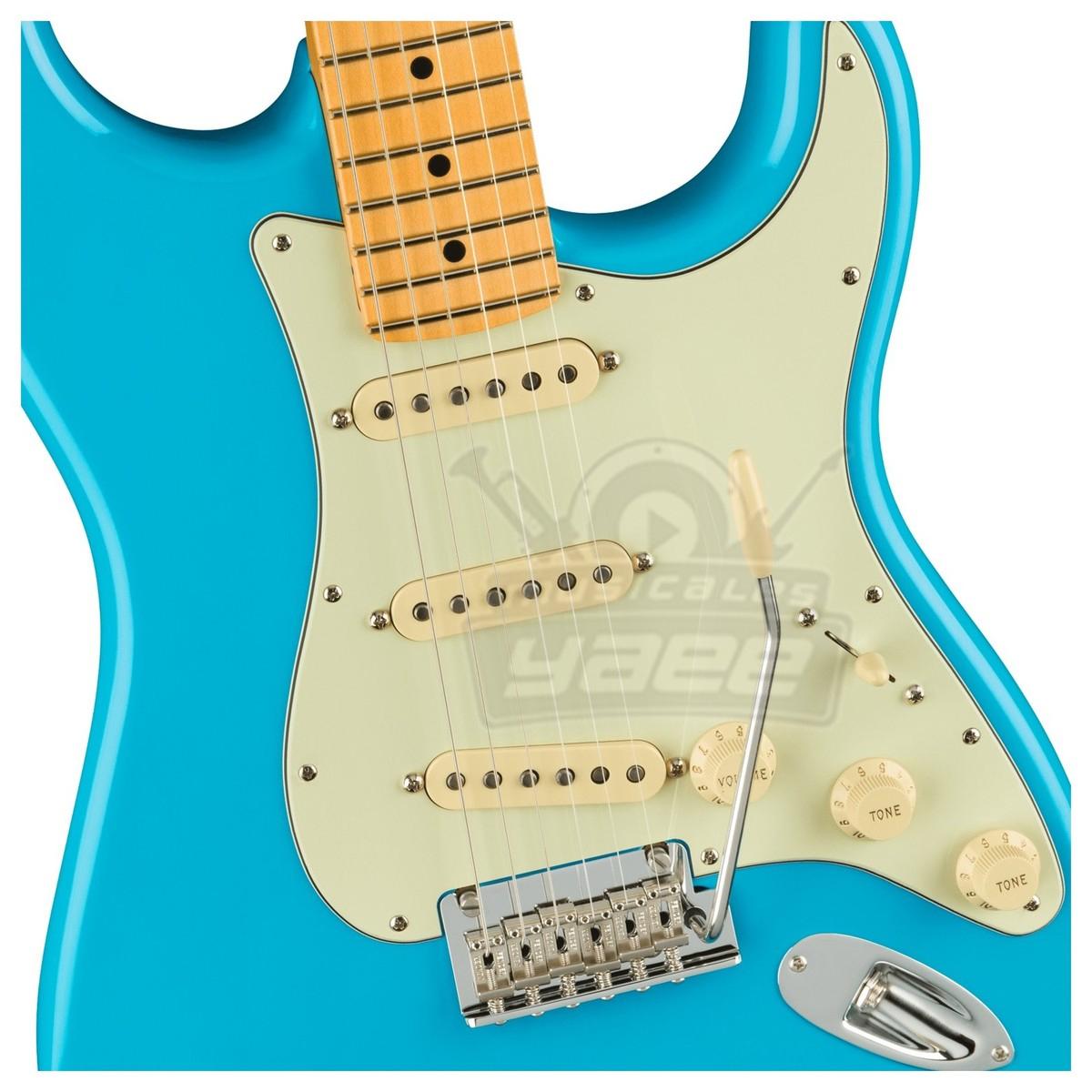 "La American Professional II Stratocaster® se basa en más de sesenta años de innovación, inspiración y evolución para satisfacer las demandas del músico de hoy en día. Nuestro popular mástil" Deep C "ahora tiene bordes de diapasón redondeados, un acabado satinado" Super-Natural "y un talón de mástil recién esculpido para una sensación sumamente cómoda y de fácil acceso al registro superior. Las nuevas pastillas de bobina simple V-Mod II Stratocaster son más articuladas que nunca y conservan la calidez y el timbre de campana. Un trémolo mejorado de 2 puntos con un bloque de acero laminado en frío aumenta el sustain, la claridad y el brillo de alta gama.