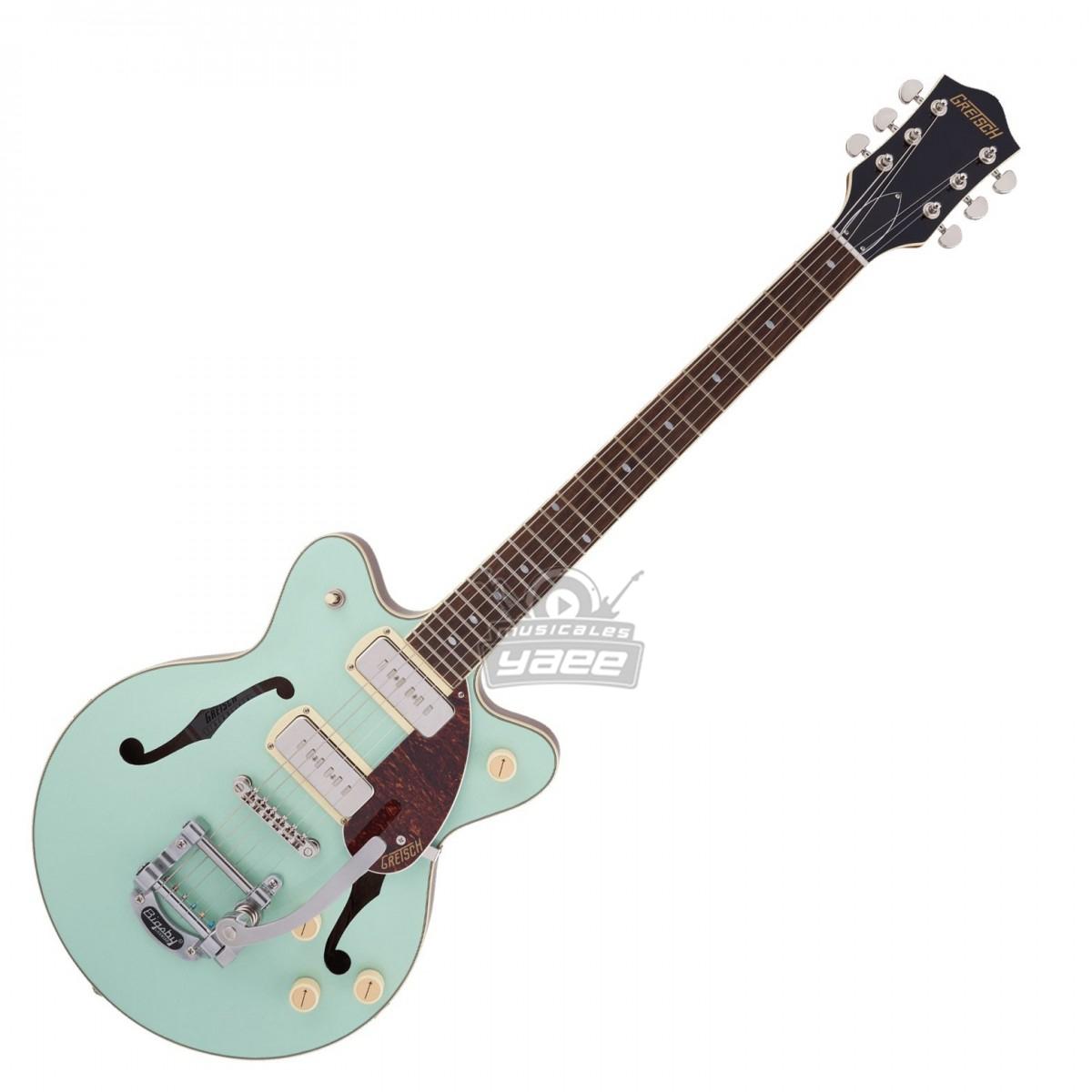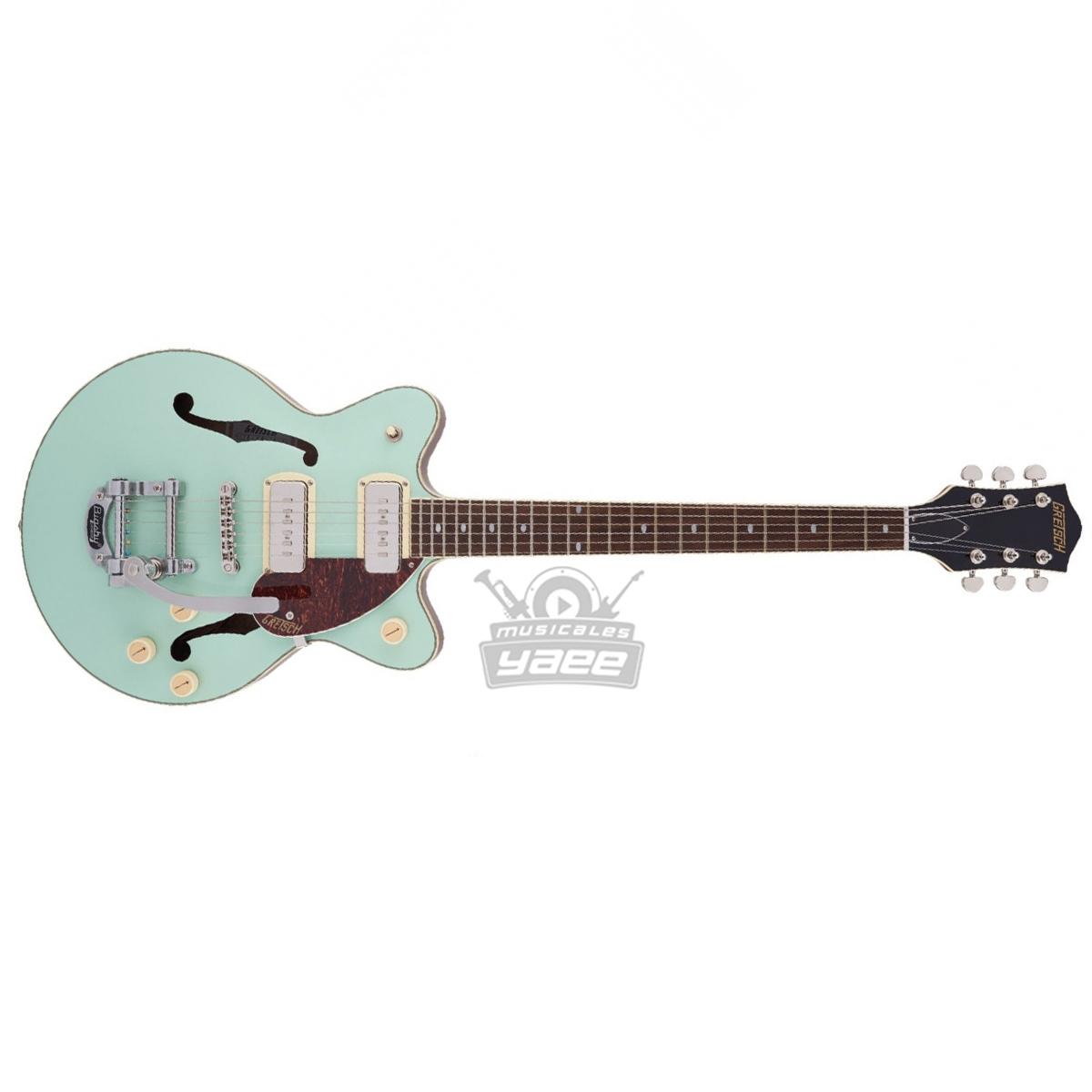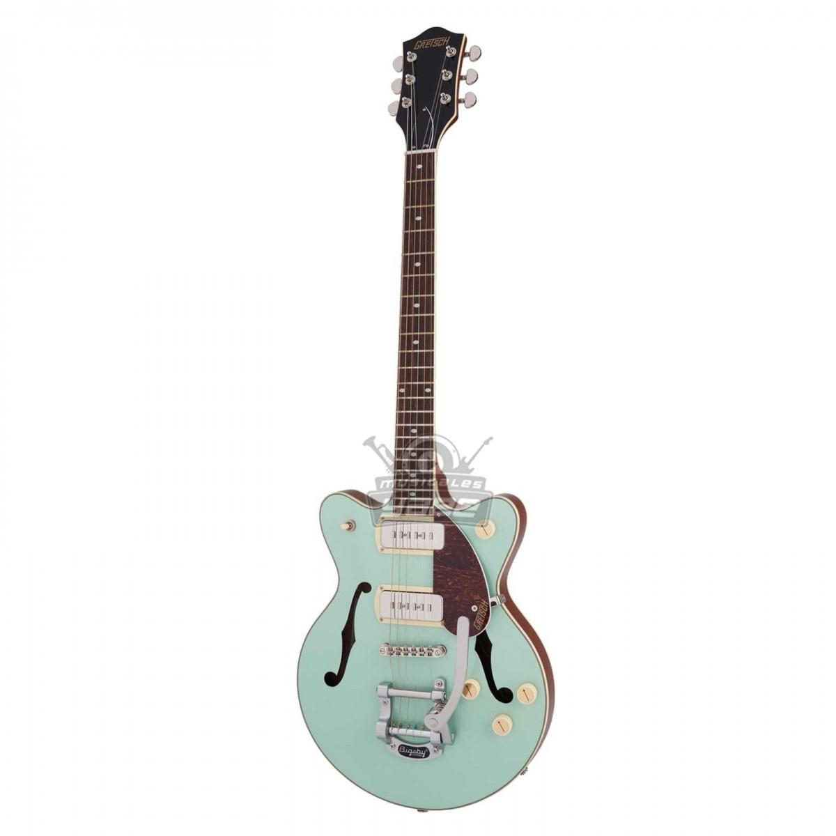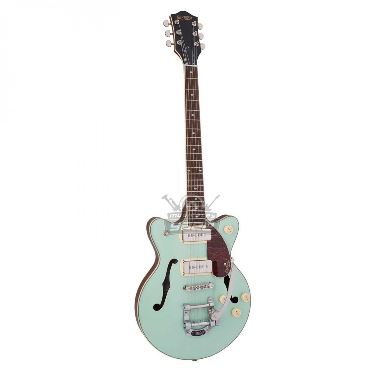 Inimitable estilo Gretsch en un paquete más pequeño. El Gretsch G2655 P90 Streamliner fue diseñado para la pura comodidad de juego. No dejes que su pequeño tamaño te engañe, las pastillas FideliSonic 90 tienen un poderoso paquete punch. El diseño de hollowbody, con un bloque central para aumentar el sostenimiento, ofrece esa bella resonancia y ese tono sublime que está garantizado para hacer bailar a la gente. El sistema Bigsby B70 Vibrato le permite añadir un vibrato extra a sus lengüetazos y acordes, haciéndolo brillar con fuerza. Esta es una guitarra que nunca te decepcionará, ni en el escenario ni en el estudio.
