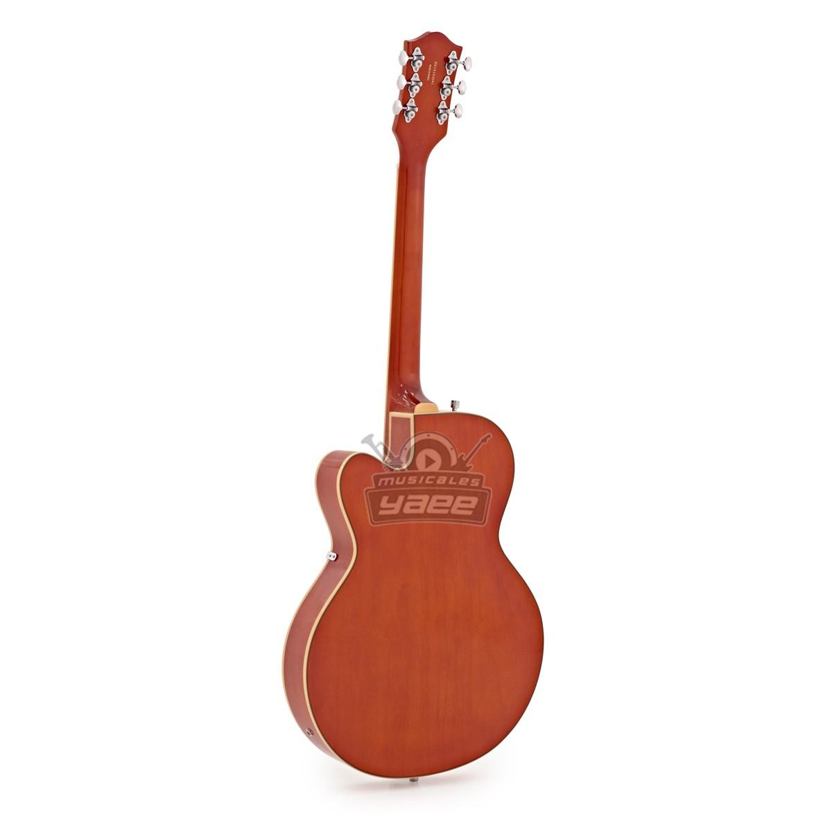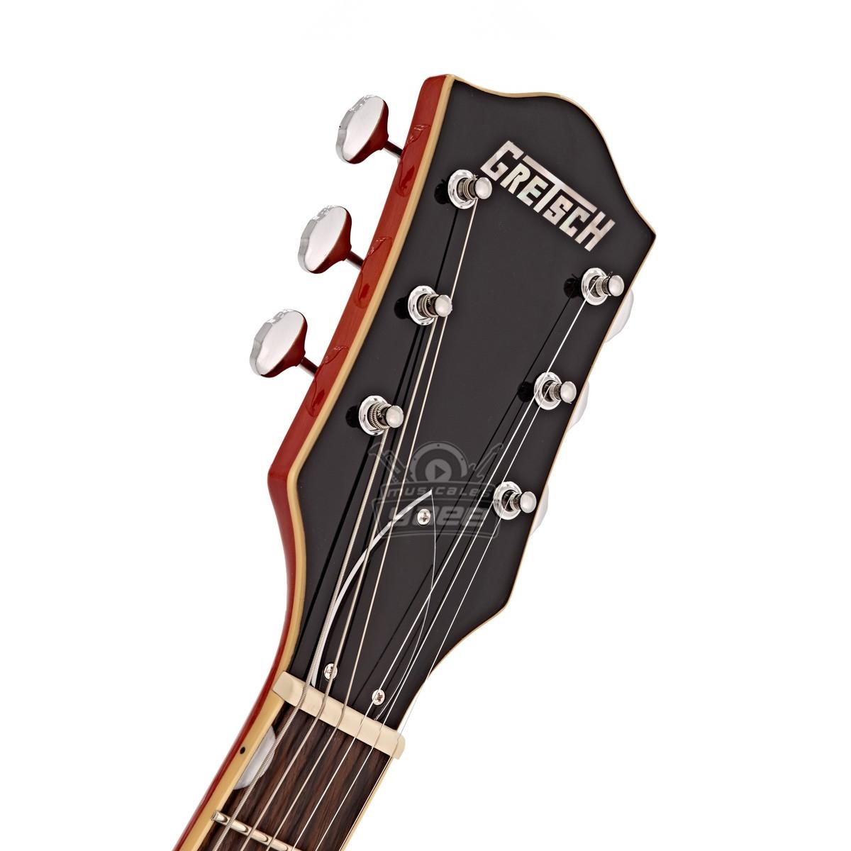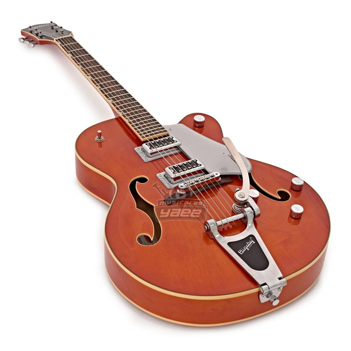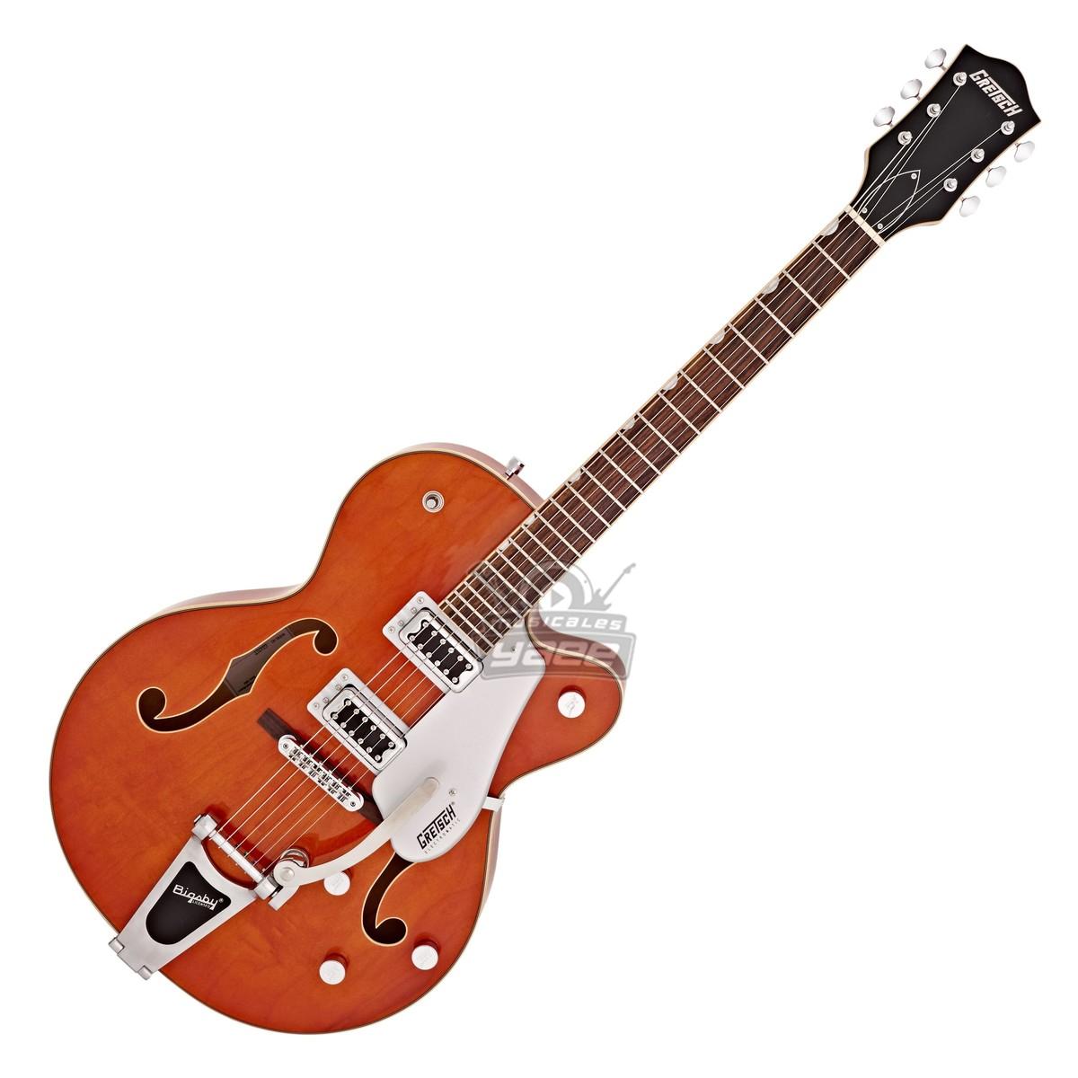 La Gretsch G5420T Electromatic de cuerpo hueco cuenta con una construcción single cutaway y elegantes agujeros "f", para obtener la tonalidad y estilo fundamental Gretsch. El cuerpo hueco de arce se combina con unas pastillas humbuckers Black Top Filter'Tron pickups para producir una voz fenomenal - el sonido del rock'n' roll por excelencia. Para el 2016, la G540T también cuenta con un ribeteado laminado envejecido, un cabezal 6120 estilo años 50, golpeador silver plexi con el logo Electromatic, incrustaciones perladas en el diapasón incrustaciones, conmutador de tres vías y un impresionante acabado en Orange Stain.
