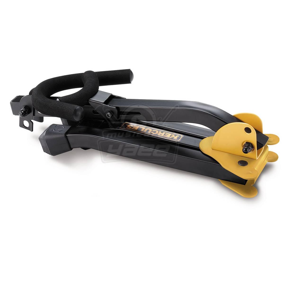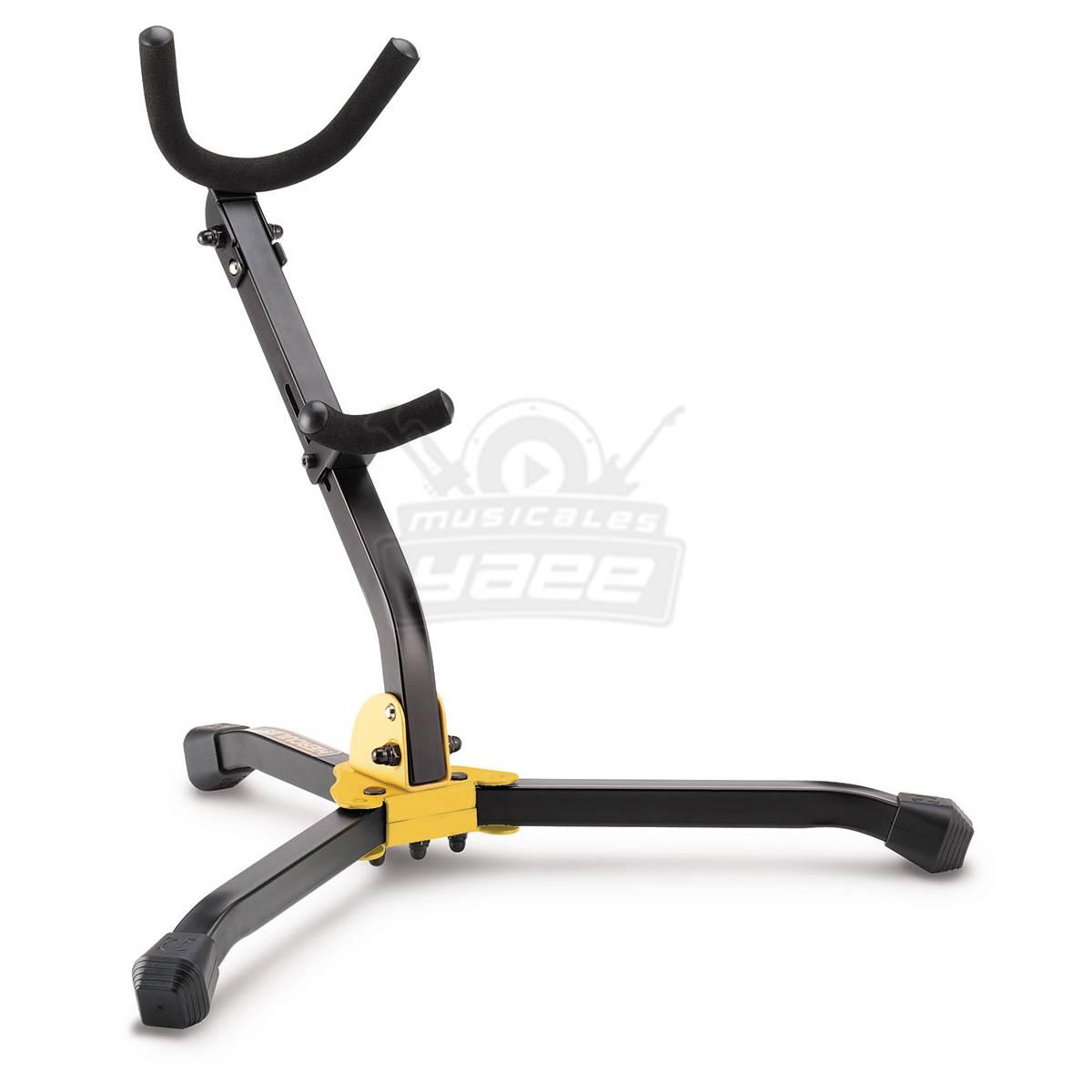 El soporte para saxofón HERCULES DS530BB tiene un yugo plegable, un respaldo ajustable y pasadores de bloqueo que son seguros y estables para usar con saxofones tenor o alto.
