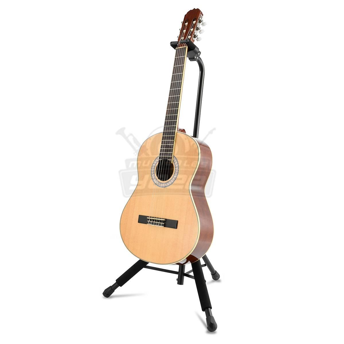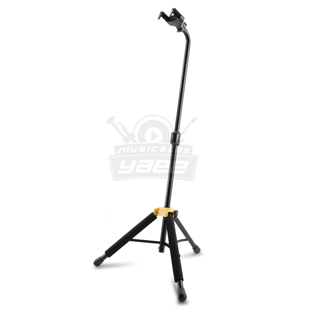 El soporte de guitarra HERCULES GS414B PLUS presenta el yugo del sistema de agarre automático (AGS), el embrague de ajuste de altura instantáneo y la goma de espuma especialmente formulada (SFF) en todos los puntos de contacto.