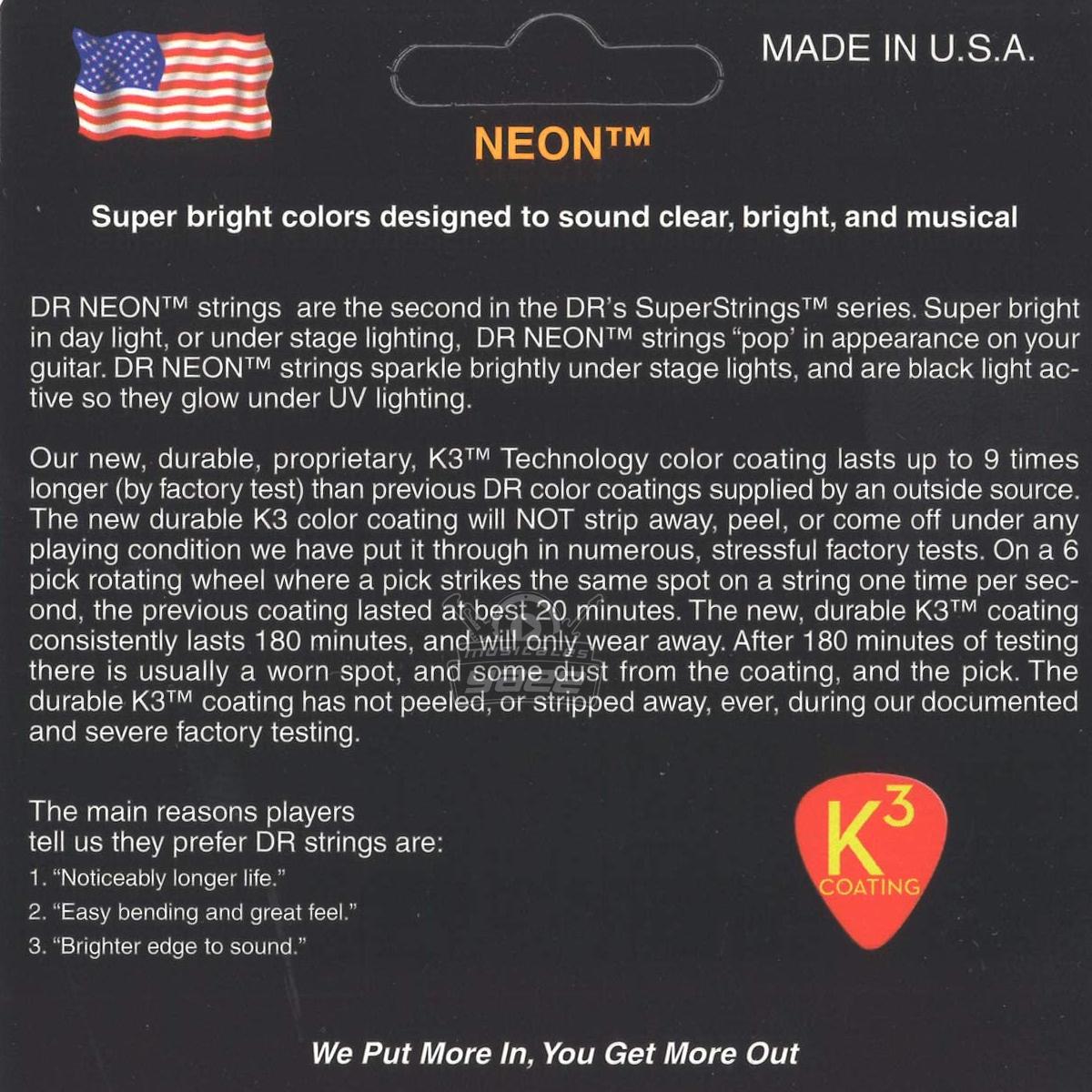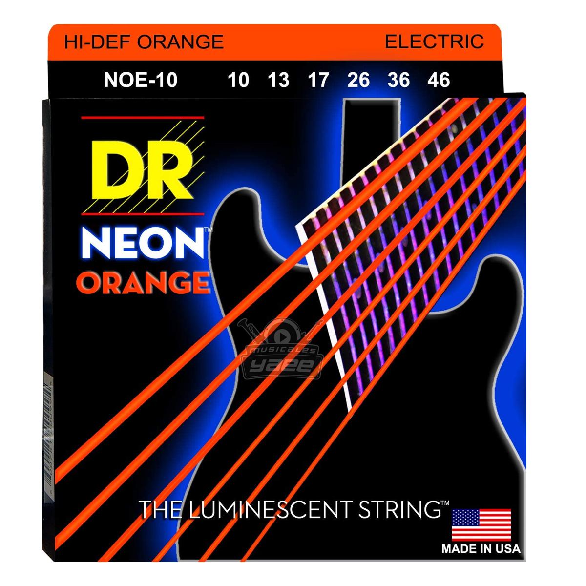 Obtenga cuerdas con una presentación de escenario seria y llamativa, así como un tono y una respuesta estelares con las cuerdas de guitarra eléctrica con revestimiento K3 de neón naranja DR Strings. Como todas las cuerdas DR, las Hi-Def Neon están hechas a mano para una cuerda más precisa. Y con una técnica de recubrimiento K3 patentada, estas cuerdas ofrecen una entonación excelente y un tono eléctrico claro y contundente. La construcción de núcleo hexagonal de Neon Hi-Def se basa en técnicas de fabricación de cuerdas probadas en el tiempo que producen cuerdas preparadas para una respuesta y un sustain maravilloso. Y estas cuerdas están activas con luz negra, por lo que si tocas bajo luces negras, ¡brillarán! Estas cuerdas son las favoritas entre los guitarristas.