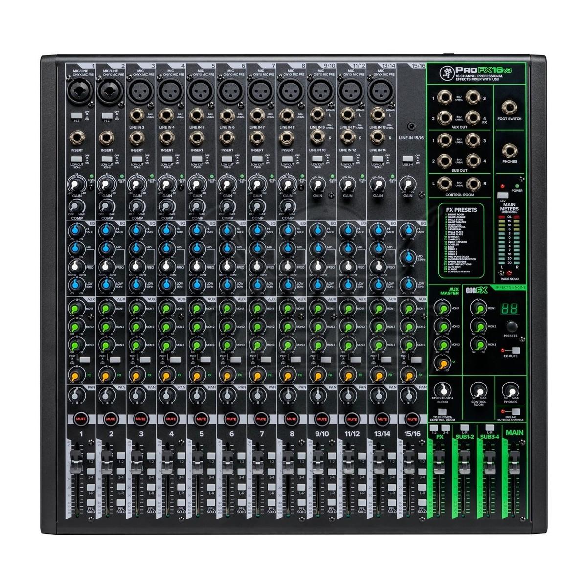 El Mackie ProFX16v3 mezclador analógico de 16 canales con USB le ofrece todo lo que necesita para conseguir el sonido perfecto. Además, con el diseño 'Built-Like-A-Tank' de Mackie, puede estar seguro de que esas características estarán a su lado durante años.