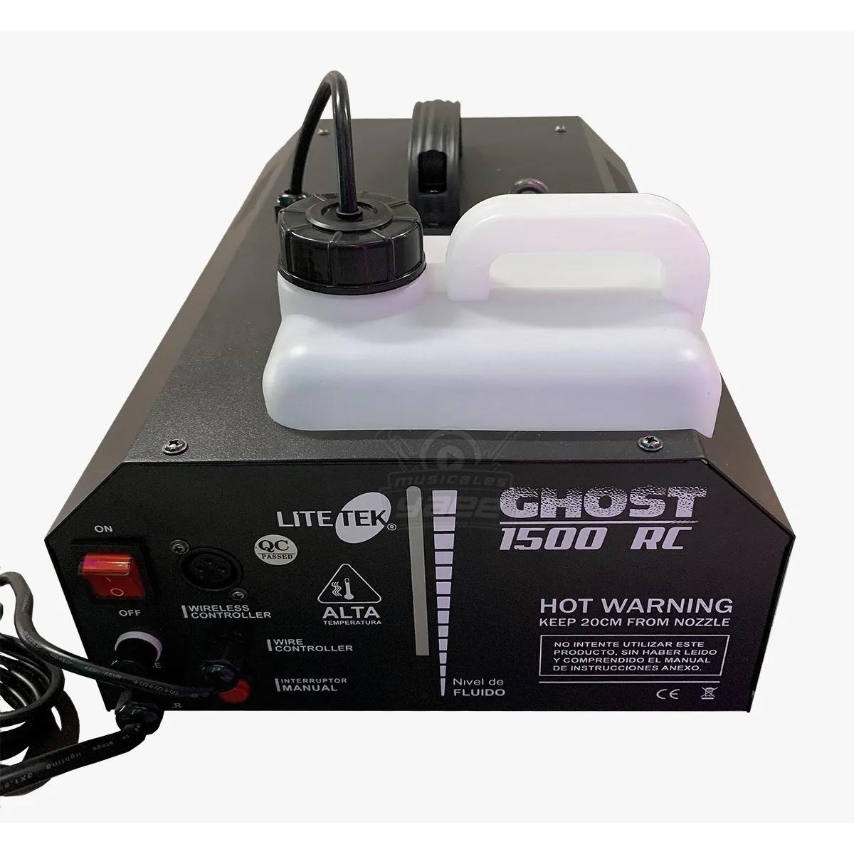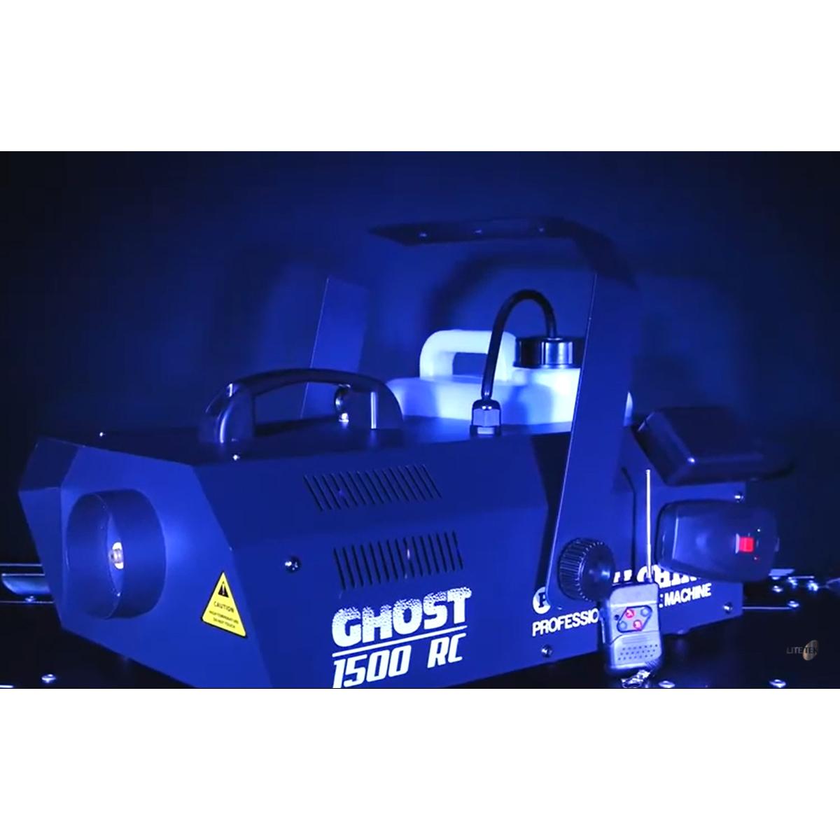GHOST 1500 RC es una máquina de humo potente. Puede ser operado vía control DMX, también puede trabajar manualmente y programada en su control personal que viene incluido. Funciona con líquido de humo normal. Resalta efectos de iluminación y genera una densa nube que ayuda a crear increíbles ambientes.