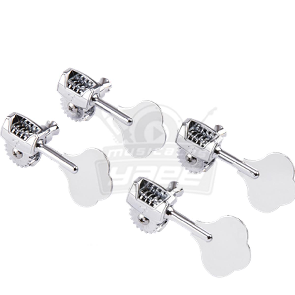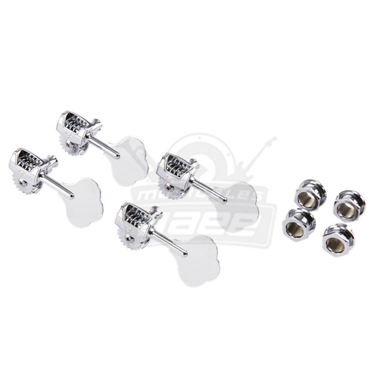 Juego de cuatro afinadores de cromo pulido para usar en las guitarras Precision Bass® y Jazz Bass® más modernas. Más anchos en la parte superior que en la parte inferior, los ejes estriados fuerzan los devanados de la cuerda hacia abajo y los mantienen apretados, lo que da como resultado un ángulo de ruptura más nítido y consistente sobre la cejilla, creando sustain y mejor afinación, mayor estabilidad.