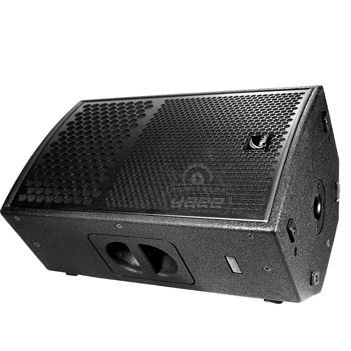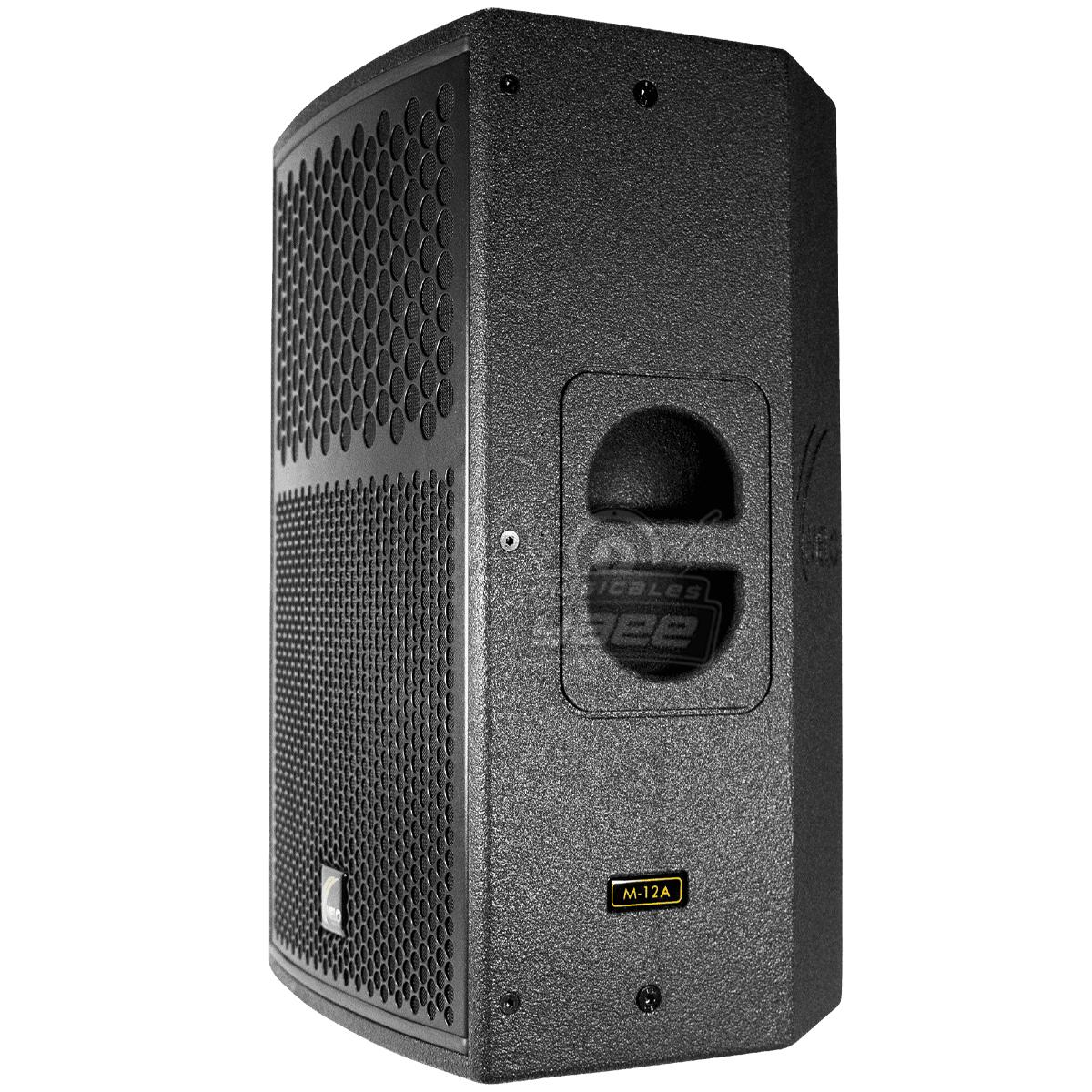 El M12-A está fabricado en triplay de 15mm y terminado en poliurea negra que mejora el sonido y alarga su vida útil, en la parte frontal se encuentra una malla de acero reforzada, en el costado y en la parte baja añadimos gomas para colocarlo en forma horizontal o vertical en el caso de uso como monitor, 4 puntos de colgado, pole mount y manijas laterales así como una trasera para fácil manipulación.