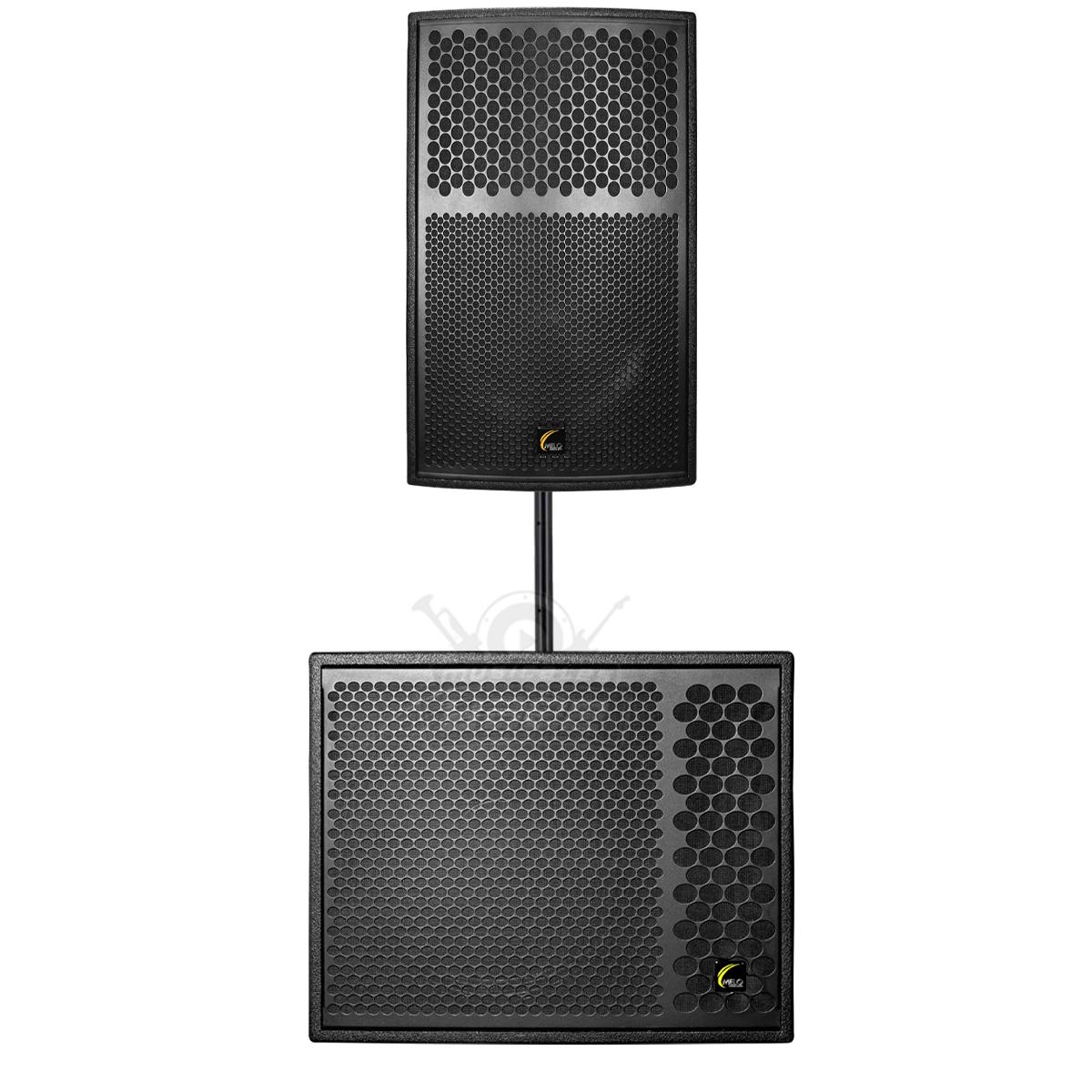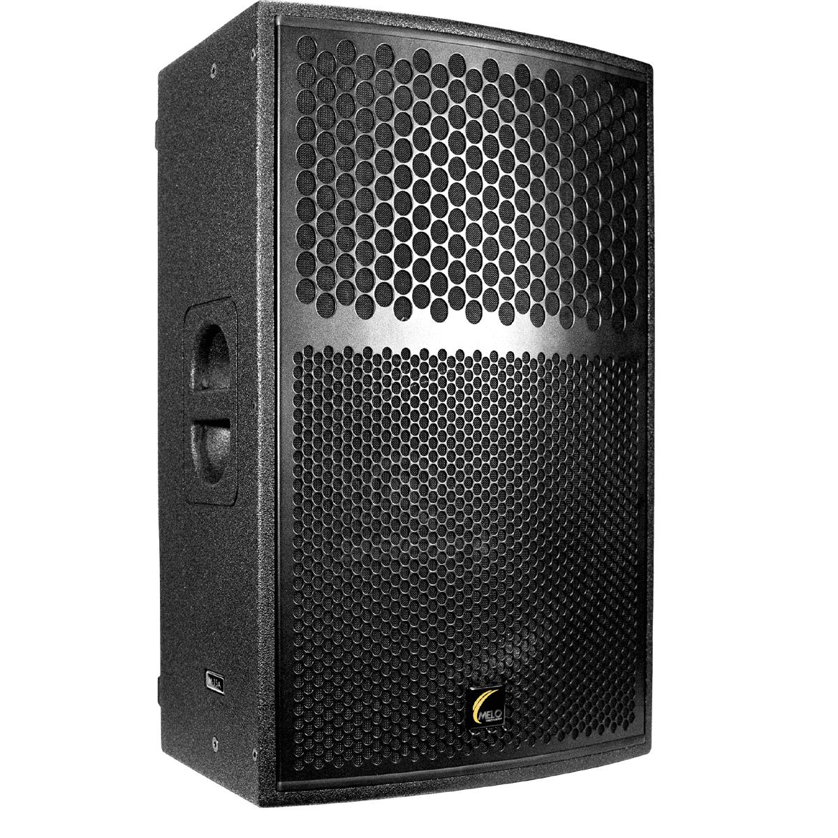 El M15-A es un bafle activo, con un componente de 15” de ferrita con bobina de 3.5”, un driver de 3” con diafragma de titanio e imán de ferrita. Potencia comprobada y medible. Fabricado en triplay de 15mm y terminado en poliurea negra que mejora el sonido y alarga su vida útil, en la parte frontal se encuentra una malla de acero reforzada, en el costado y en la parte baja añadimos gomas para colocarlo en forma horizontal o vertical en el caso de uso como monitor, 4 puntos de colgado, pole mount y manijas laterales así como una trasera para fácil manipulación.