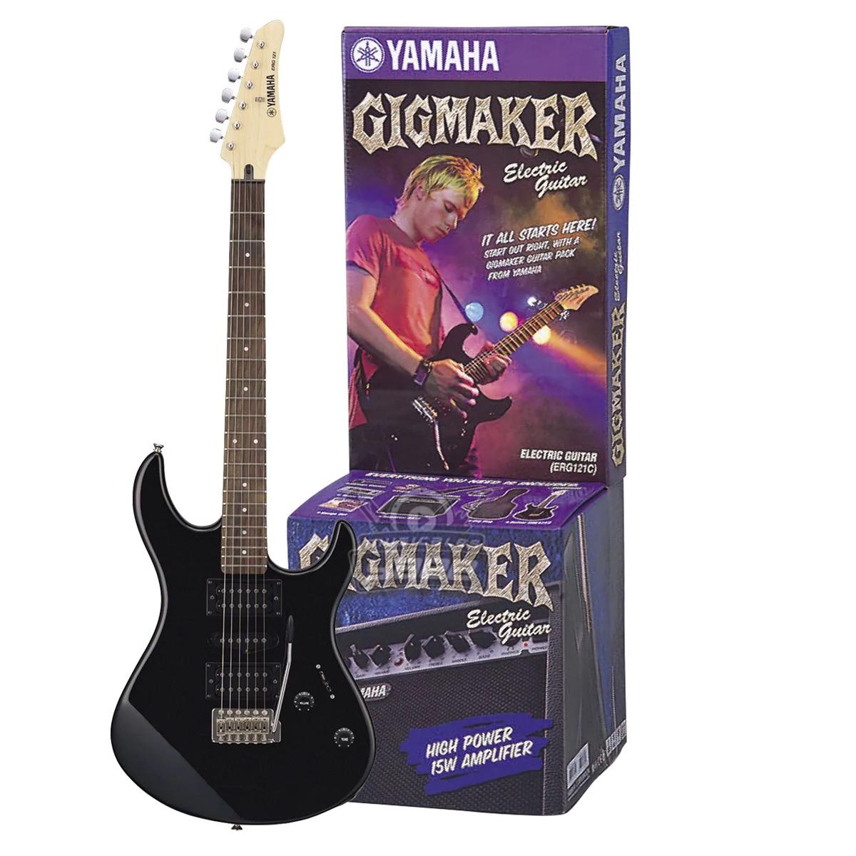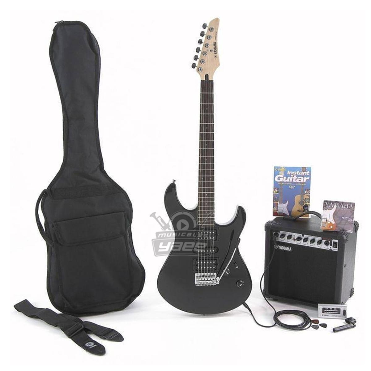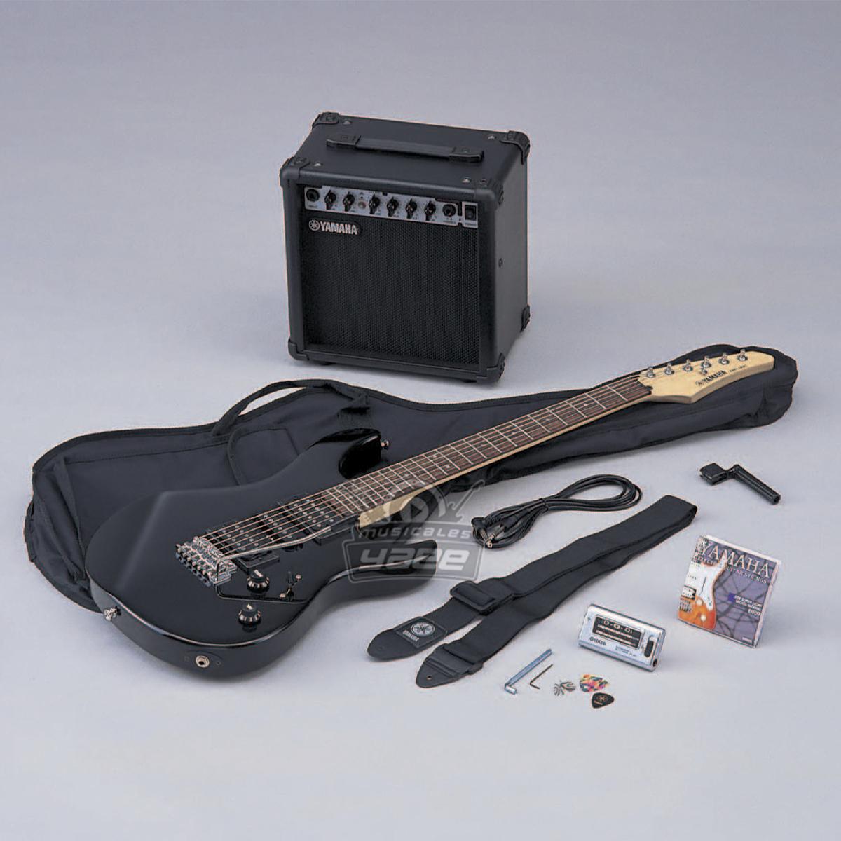 Conjunto de guitarra eléctrica que incluye la guitarra eléctrica Yamaha ERG121GPIIBL, el amplificador combo Yamaha GA15 y el sintonizador de guitarra Yamaha YT120, además de un paquete de accesorios que incluye cuerdas, bobinadora, selecciones, funda suave, cable de guitarra y correa de guitarra. Este conjunto es una solución todo en uno para guitarristas que buscan instrumentos de alta calidad con múltiples accesorios.