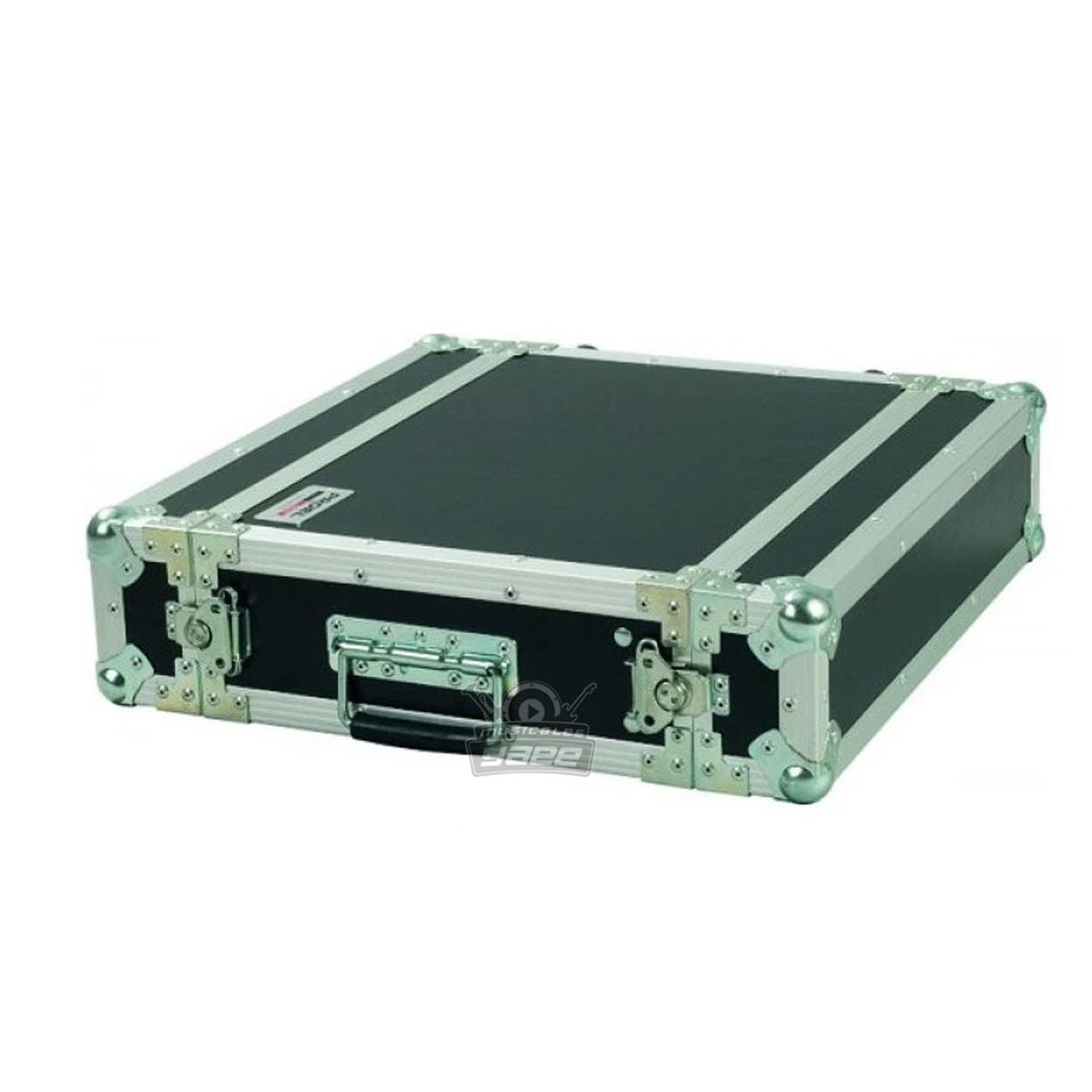 Rack de 19" pulgadas de 2 espacios, fabricado con madera contrachapada marina con unión fenólica de 5 mm de espesor, revestimiento laminado negro resistente a los arañazos, esquina de bola de acero y perfil de aluminio, profundidad interior utilizable: 250 mm, altura interna útil superior/inferior: 70 mm, terminado interno en color negro, 4 pequeñas mariposas de acero galvanizado, 2 manijas de acero galvanizado con resorte, riel delantero, juego completo de tornillos, arandelas y tuercas, patas negras de goma.