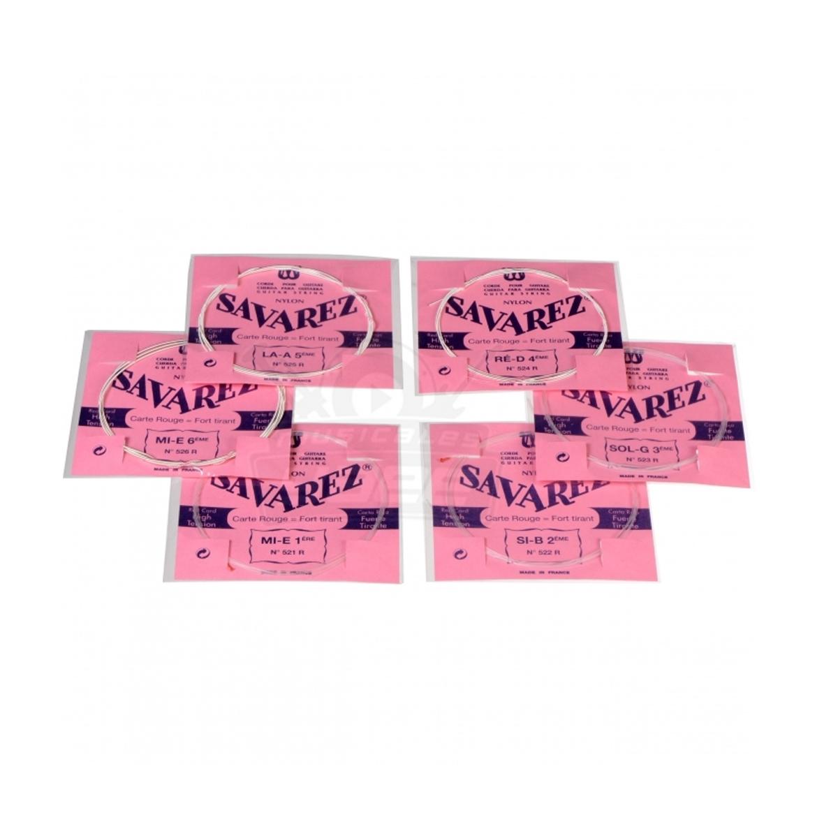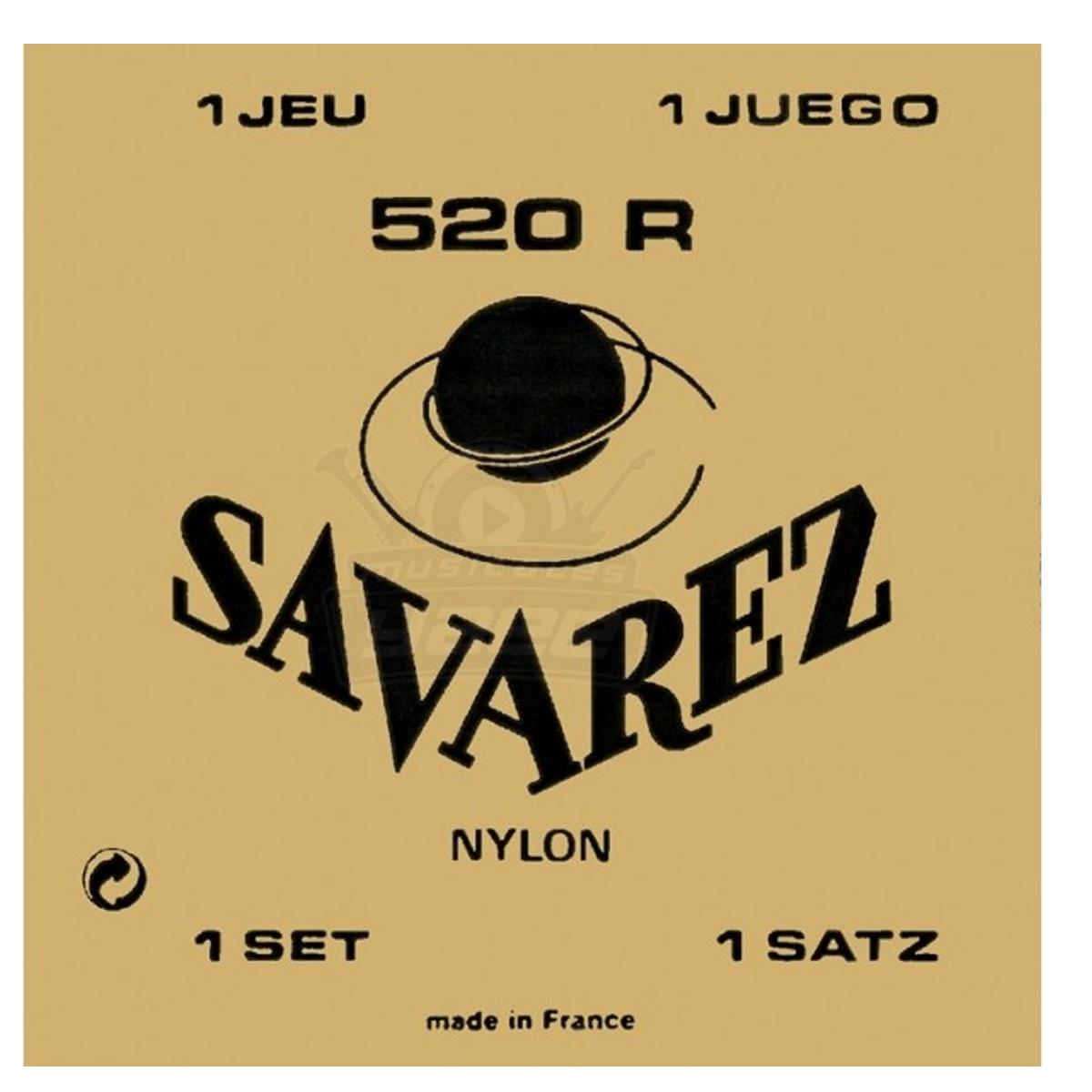 Juego de Cuerdas Savarez 520R Carta Roja. Este tipo de juego tiene unos agudos de nailon Savarez rectificados y unos bordones Savarez tradicionales. El nombre de Savarez es reconocido en el mundo entero por el famoso juego de cuerdas 520R, con cuerdas rosas, amarillas o blancas (dependiendo de la tensión). Este juego de cuerdas se convirtió en un "best seller" hace mucho tiempo y aun se conserva. Fue pionero en el mercado en cuanto a tensiones, ya que por primera vez los guitarristas podían elegir entre tensión normal (rojo), tensión alta (amarillo) y tension baja (blanco).