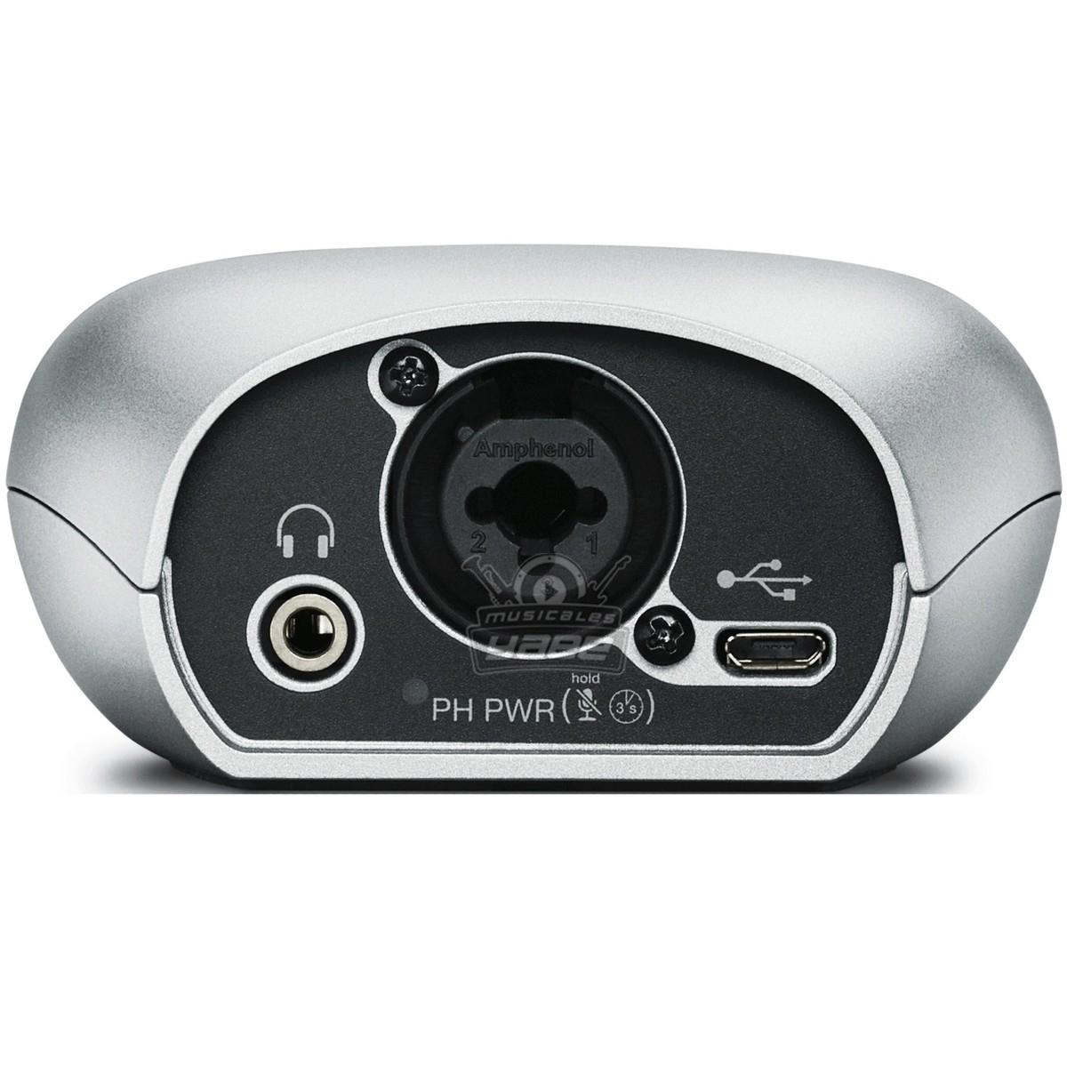 Interfaz digital de audio que permite conectar una salida profesional de micrófono por XLR o de instrumento por jack de 6,3 mm a un ordenador o dispositivo móvil. Dispone de 5 presets DSP para la ecualización, compresión, ajustes del limitador, control de ganancia, mute, volumen y alimentación phantom.