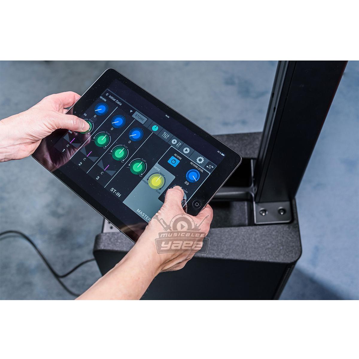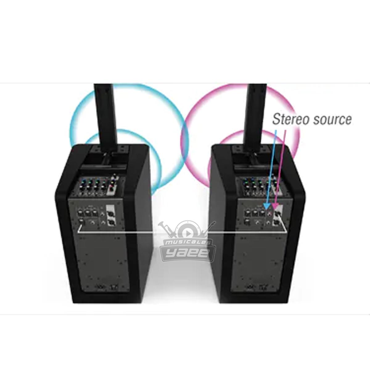 Sistema de PA portátil, 1.000 W, con mezclador digital de 5 canales, subgrave de 12 pulgadas, altavoz “line array” con 10 unidades de 1,5 pulgadas, entrada de Bluetooth, reverb digital SPX, ecualizador de mando único y compresión multibanda para la salida principal.