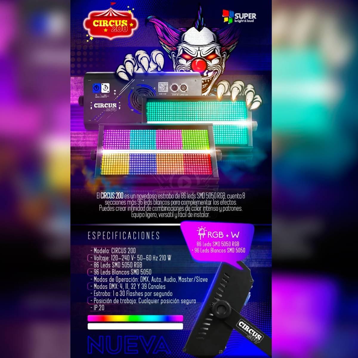 Esta espectacular y potente luminaria está hecha para sorprender y llenar de color cualquier espacio o recinto a un precio justo ¡Crea impactantes shows con tu Circus200, diseña patrones con sus 8 secciones, colores intensos + blanco, el limite es tu imaginación!