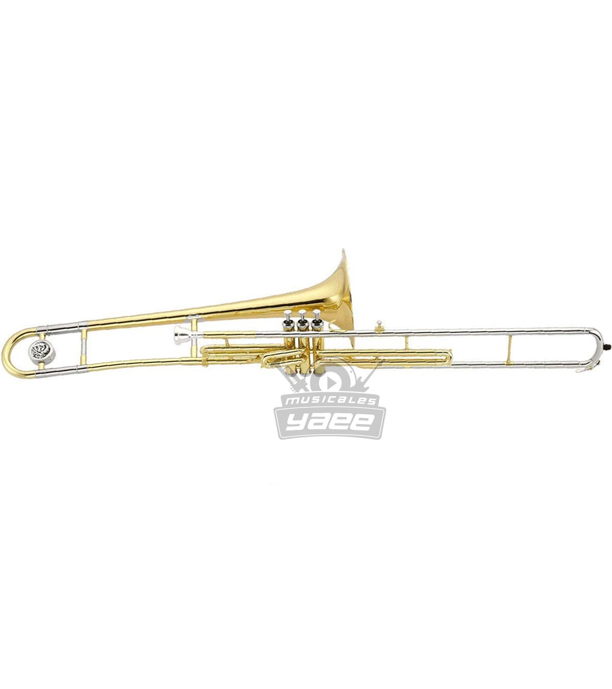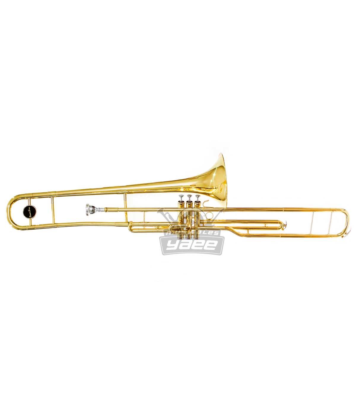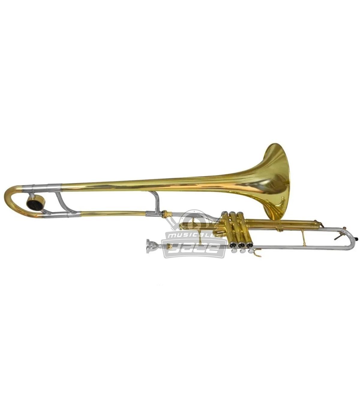 Trombón de pistones con tonalidad DO, tubería de 12.7 mm, campana en latón de 8" pulgadas, vara principal y codo en alpaca, 3 pistones de acero inoxidable, terminado laqueado e incluye un estuche ...