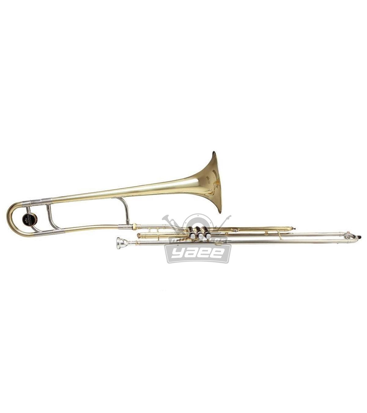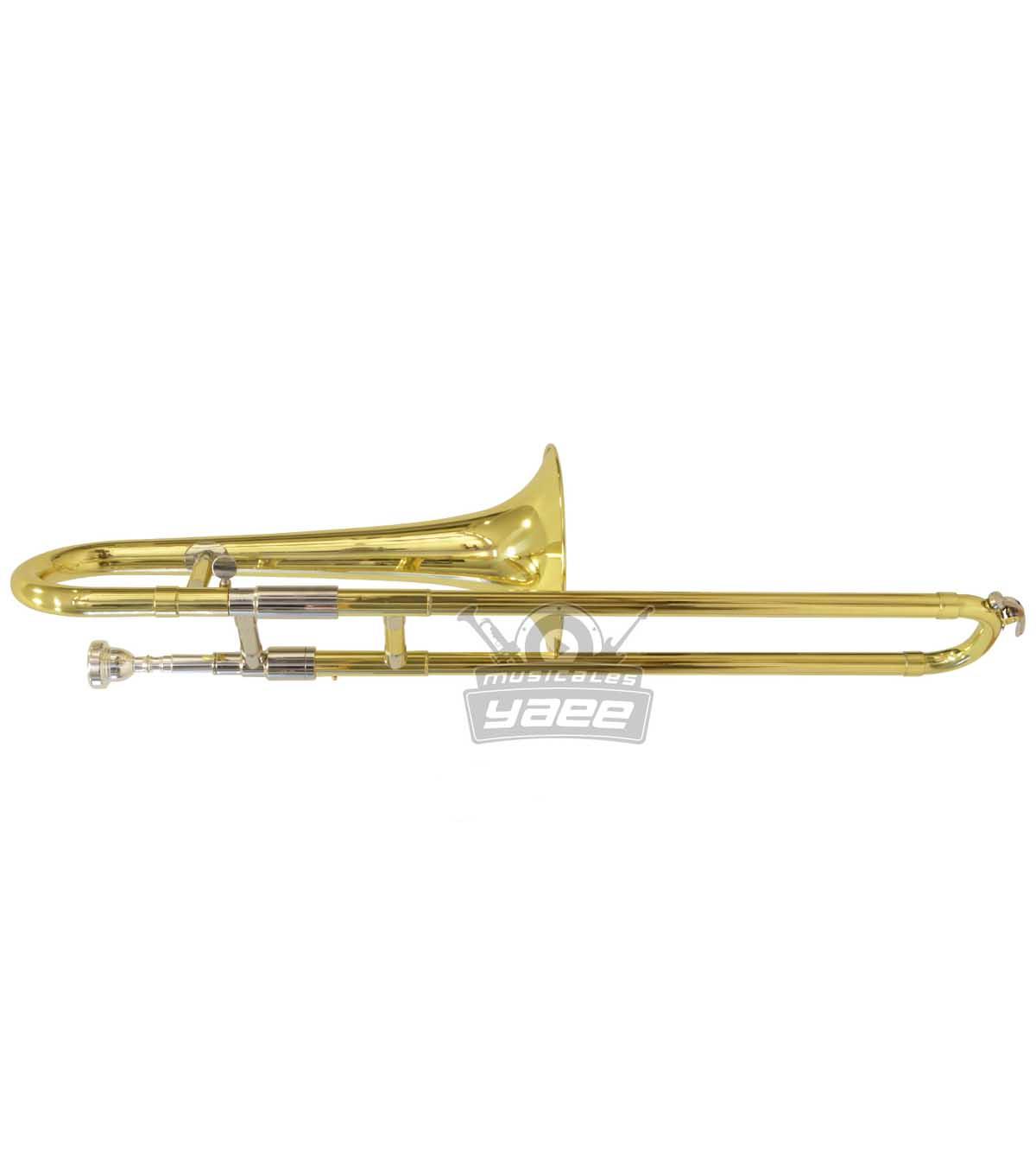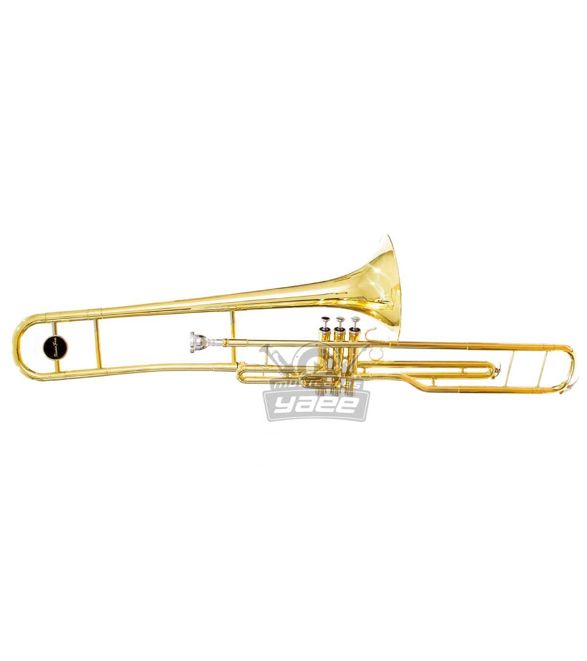 Trombón de pistones con tonalidad DO, tubería de 12.7 mm, campana en latón de 8" pulgadas, vara principal y codo en alpaca, 3 pistones de acero inoxidable, terminado laqueado e incluye un estuche ...