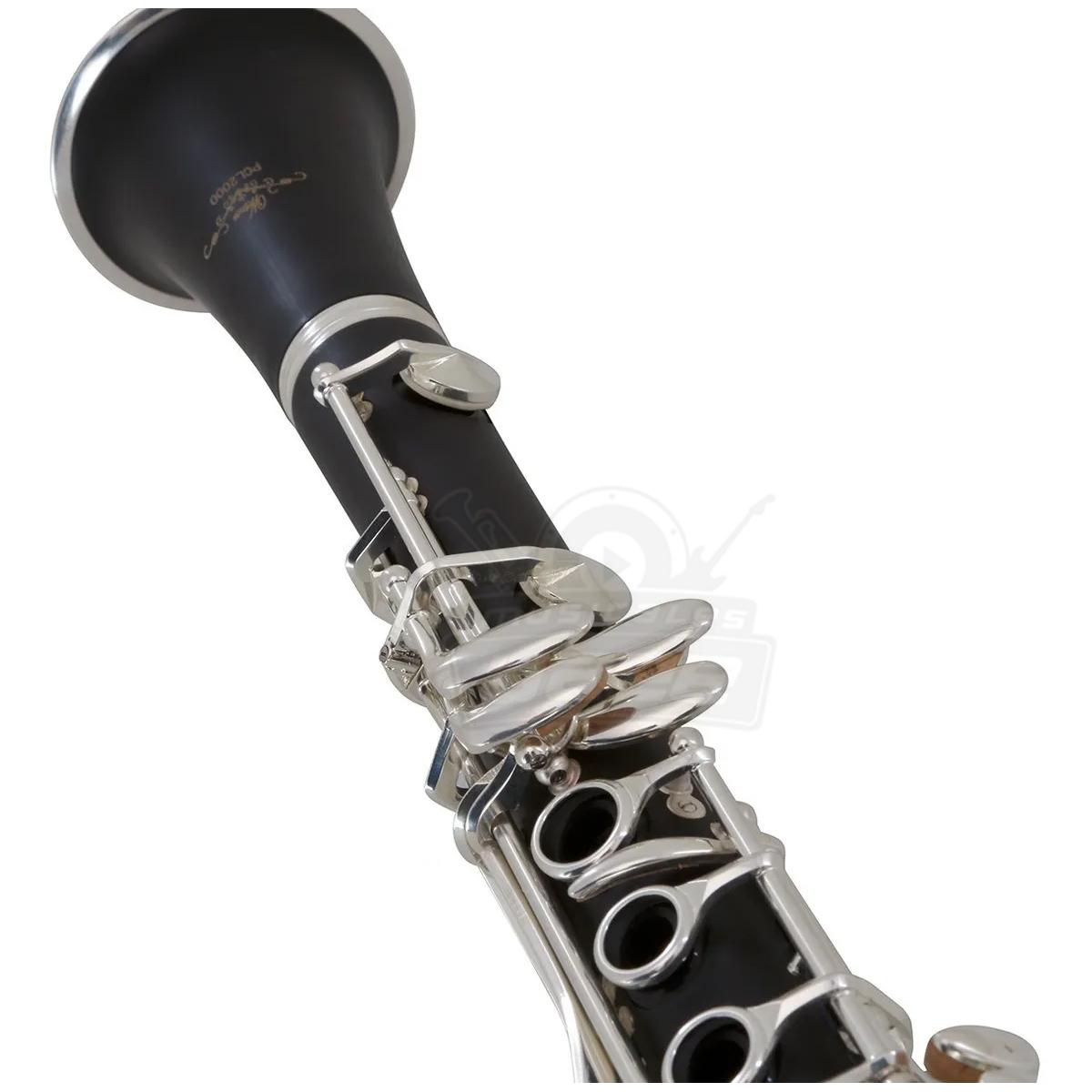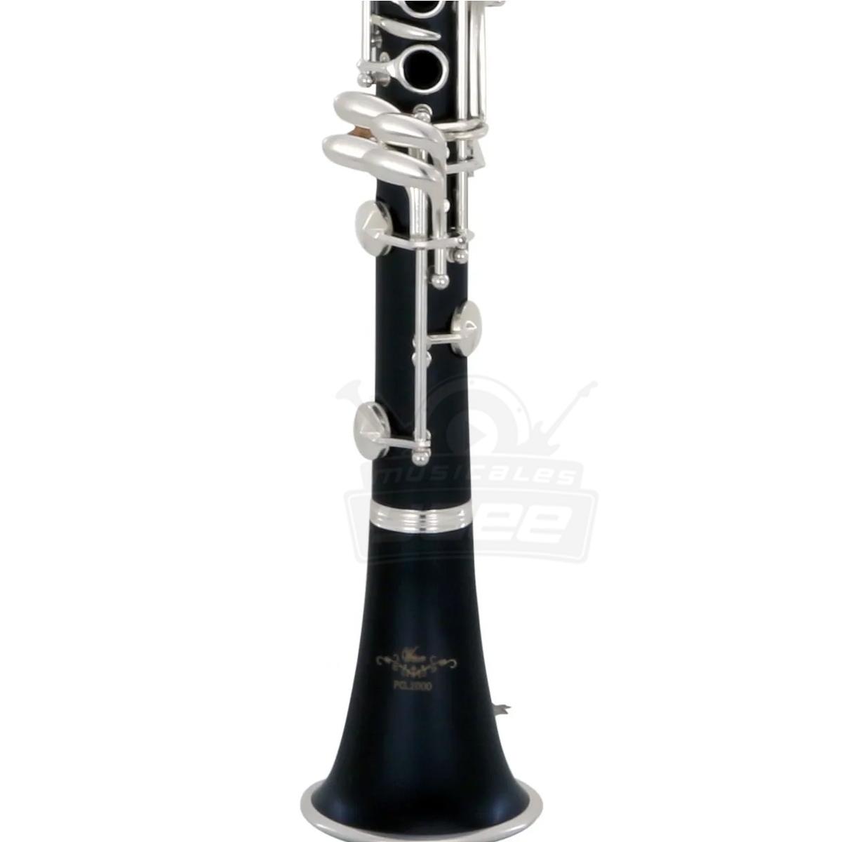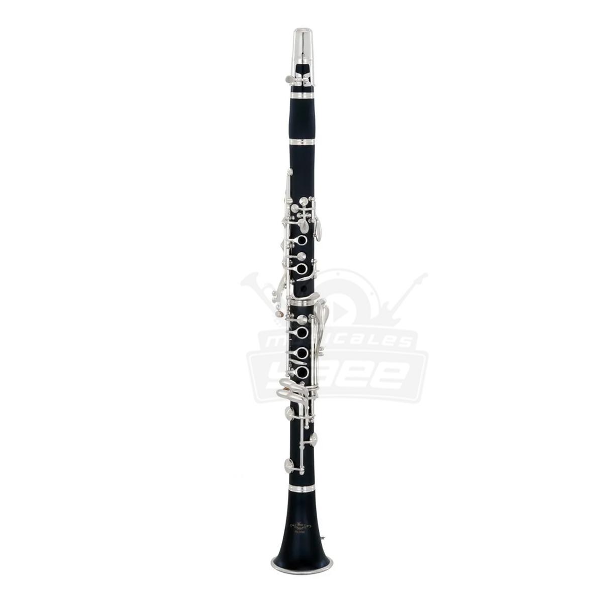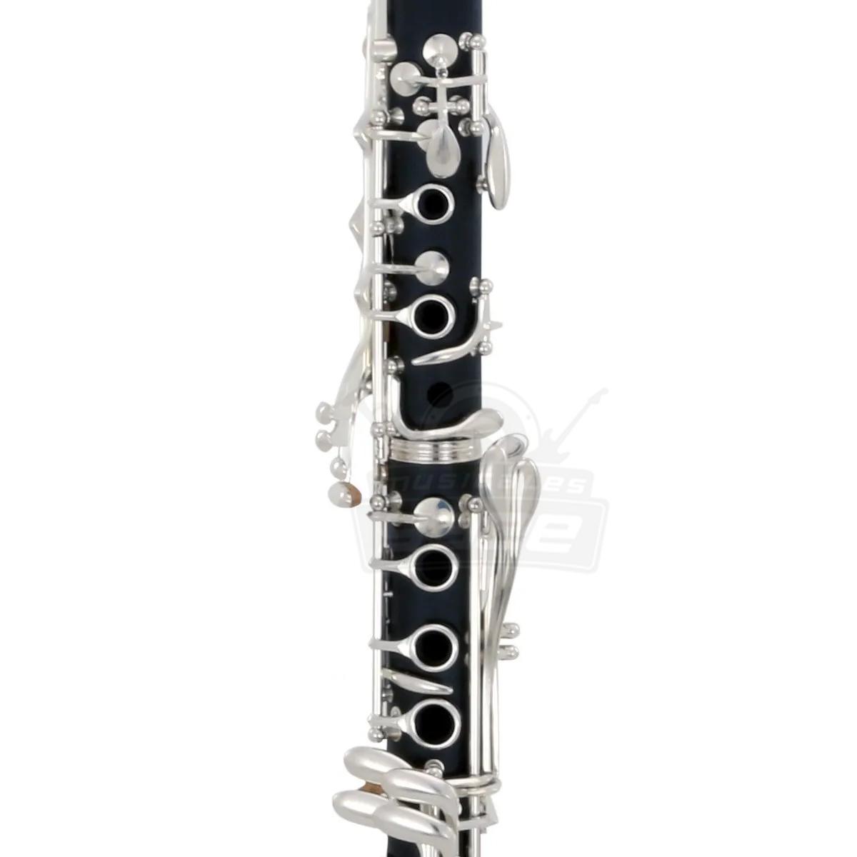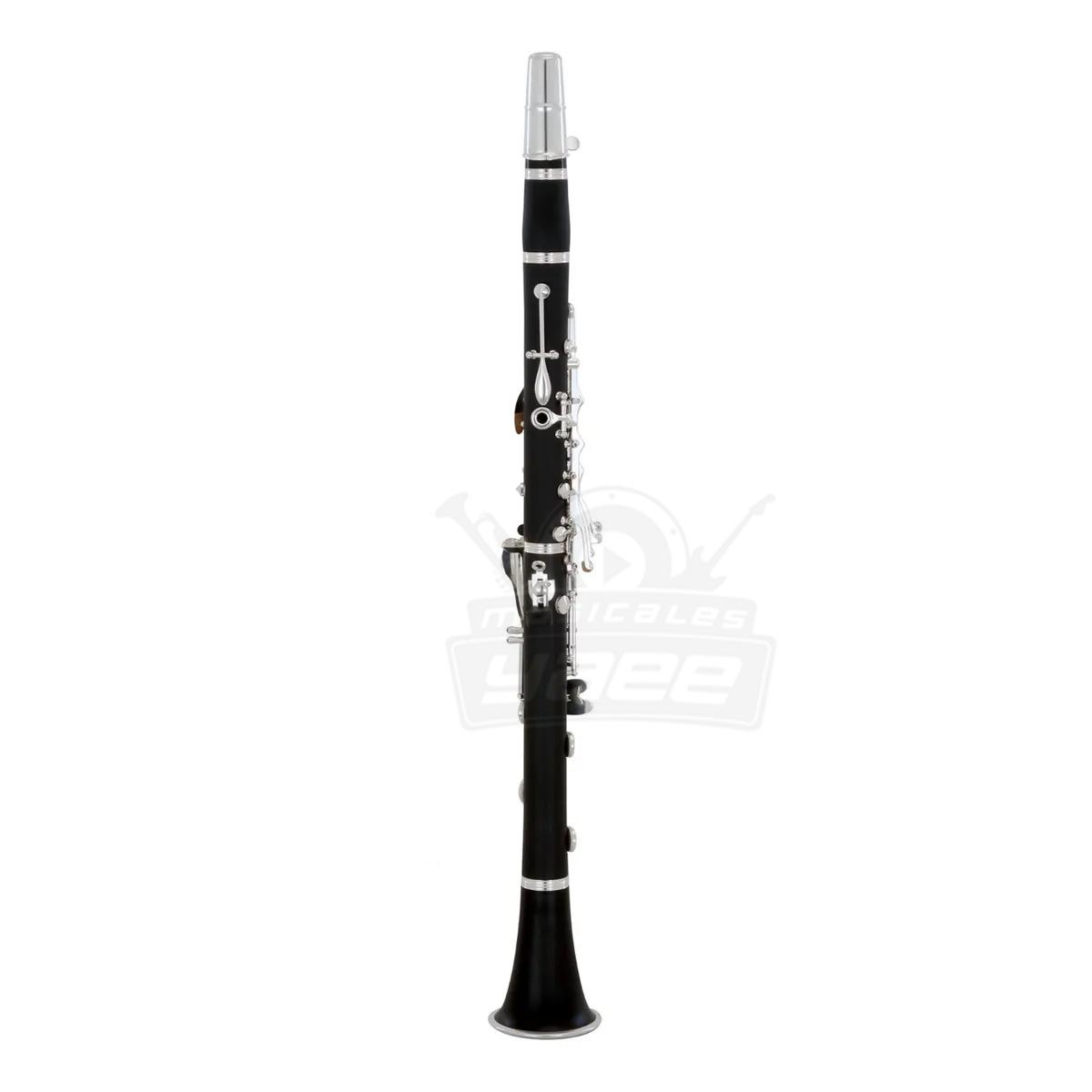Clarinete, afinación en Bb, 17 llaves, cuerpo de ebonita, llaves plateadas, descanso de pulgar metálico, barril sencillo, con estuche ligero de lona.